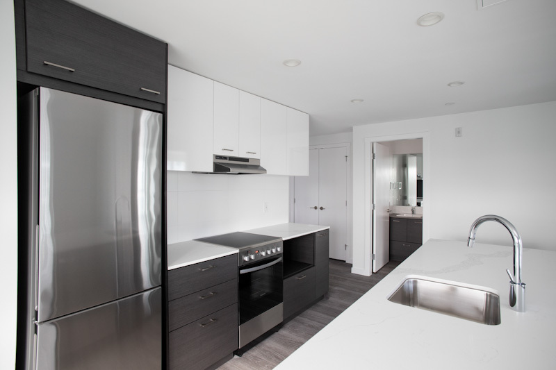 Our largest 2-bedroom plan, the D4 plan sits at 840sqft. With an 8ft long kitchen island, you have copious amounts of prep space, all while doubling as a breakfast far. Fitted with low-energy appliances, LED lights and beautiful quartz counters, this kitchen is modern and sleek. The ideal space for roommates, or families as both rooms are on opposing sides and provide a great deal of privacy. This corner suite offers large windows and natural light all year round.