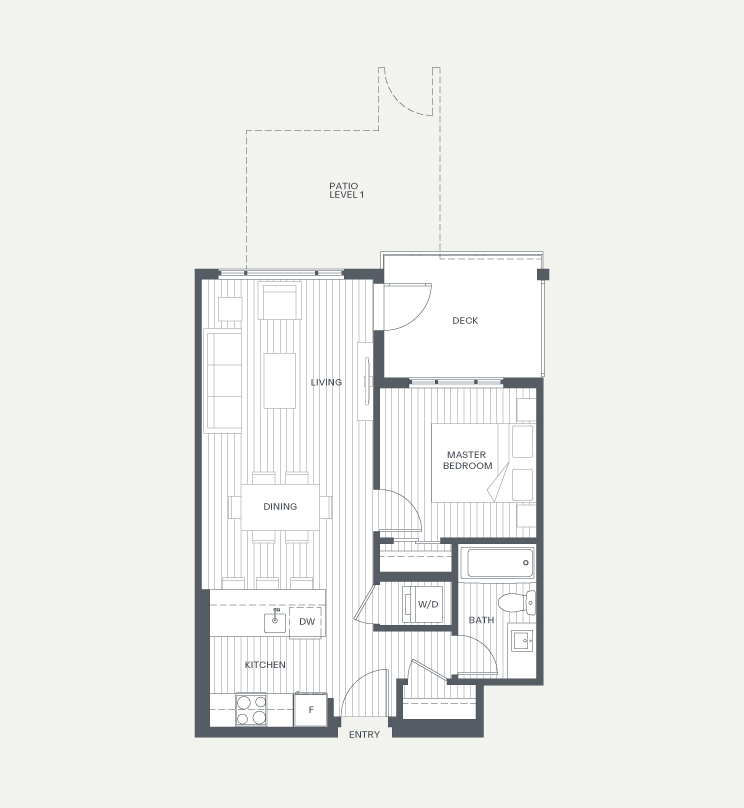 Our C1 plan is 561sqft and features a gorgeous Western exposure, with quaint views overlooking our resident’s courtyard. The large kitchen island doubles as a breakfast bar and is topped with beautiful quartz counters. Modern and efficient finishes include low-energy, stainless-steel appliances, low-flow faucets and in-suite laundry. High-quality vinyl plank floors fill the suite for a clean and modern finish.