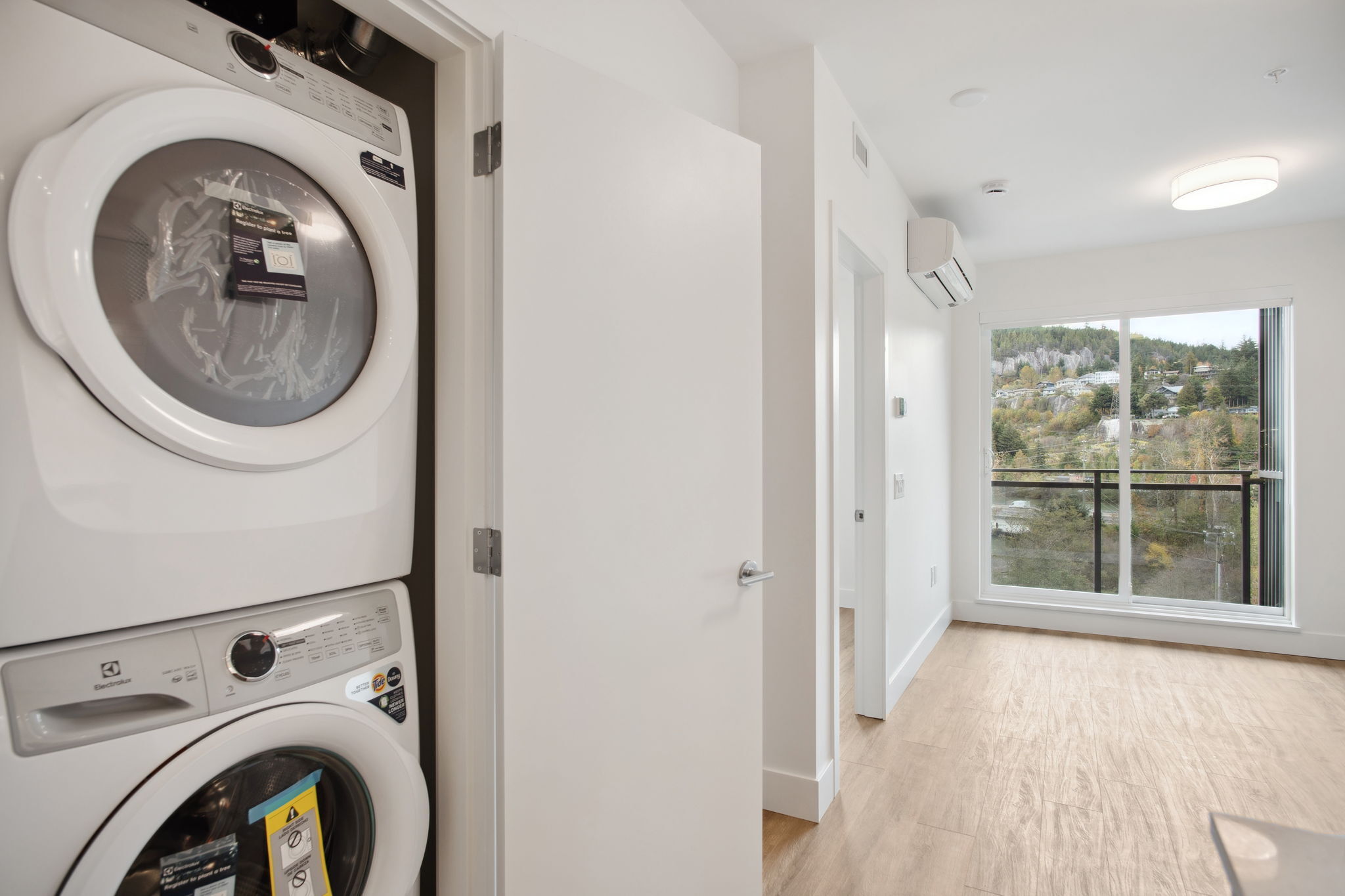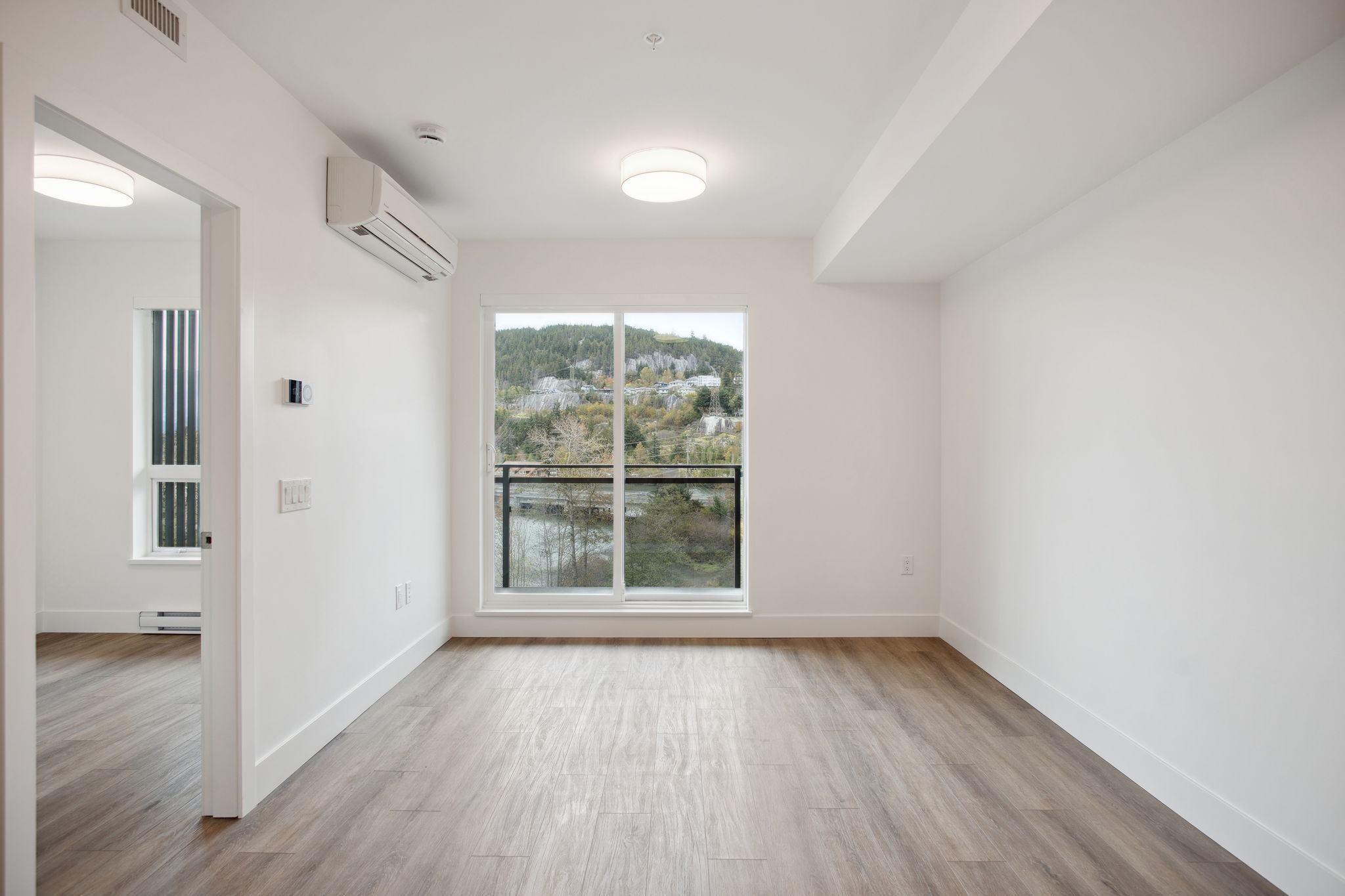 An efficient plan with the added bonus of a flex room for work or storage. The living area extends toward the balcony, where windows capture mountain views. Modern appliances, air conditioning, and in-suite laundry come standard.