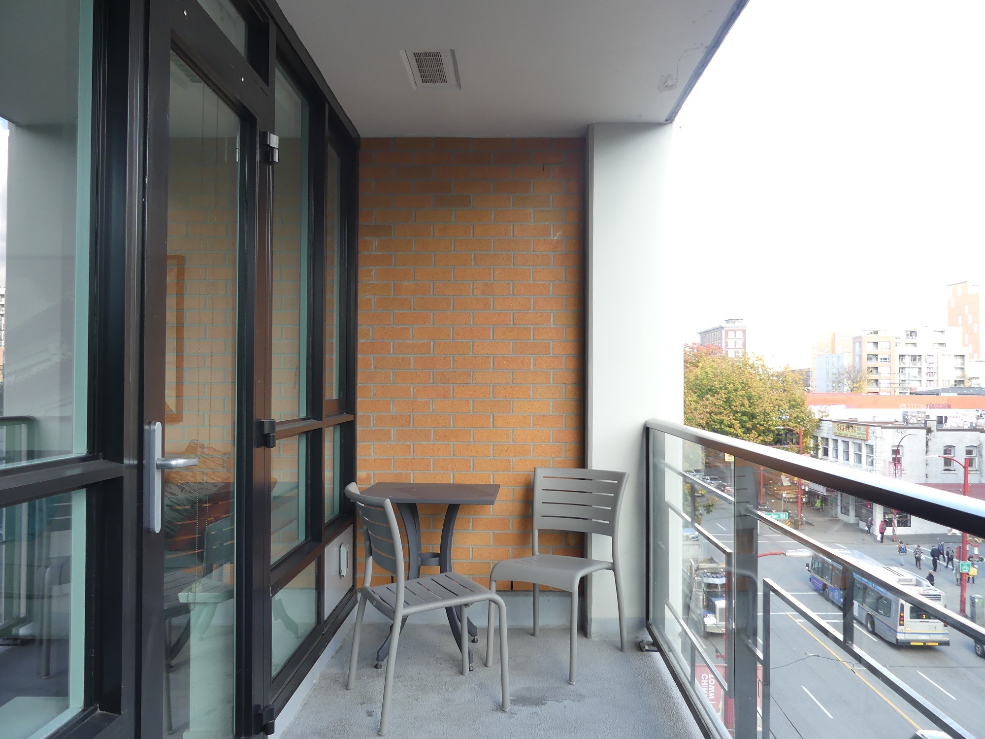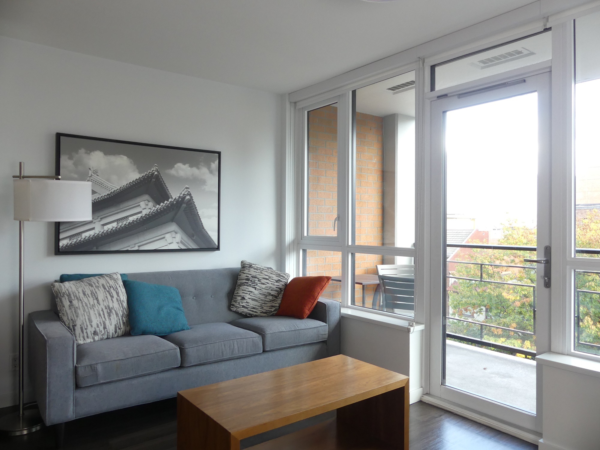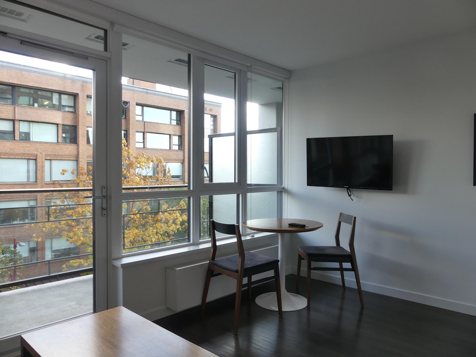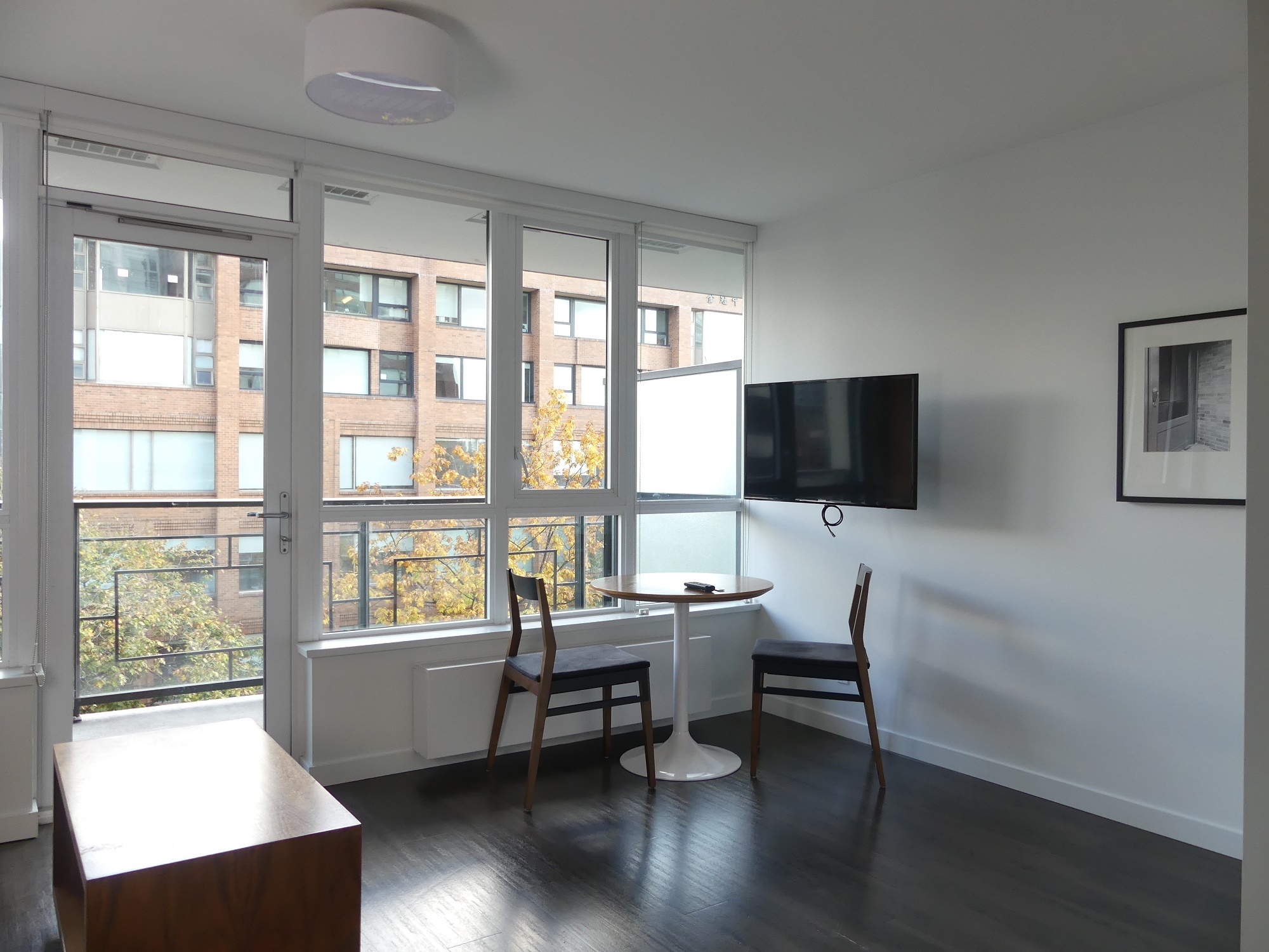 Facing East, our A1 studio plan comes semi-furnished with a Murphy bed, couch, dining table, patio table, wall-mounted television, and even an Apple TV. The suite features modern finishes including: stone countertops, vinyl plank floors and a full appliance package. Relax on the large patio, perfect for people watching below on Main Street.