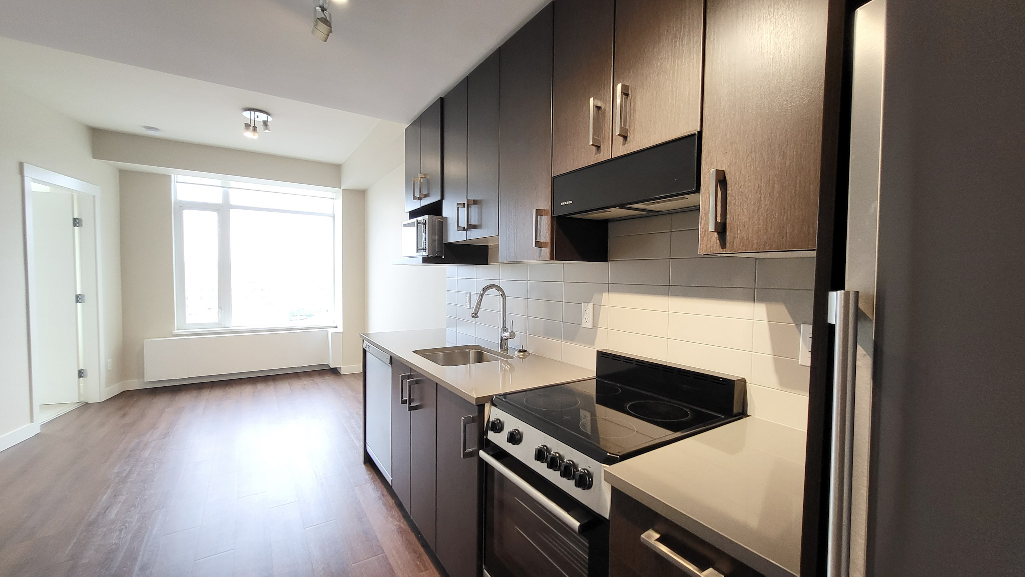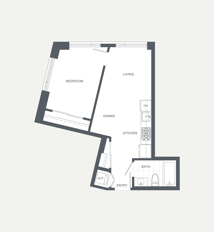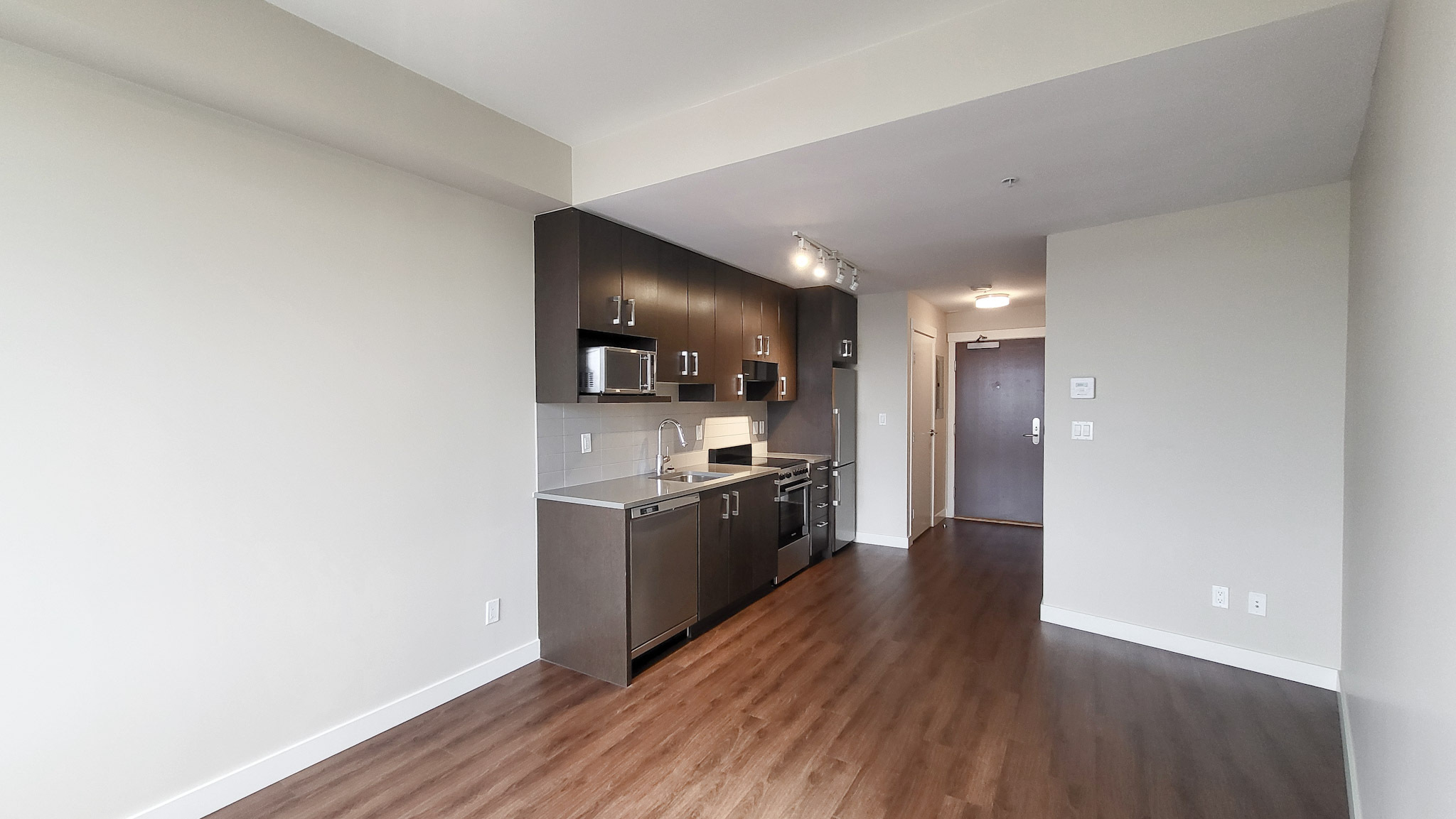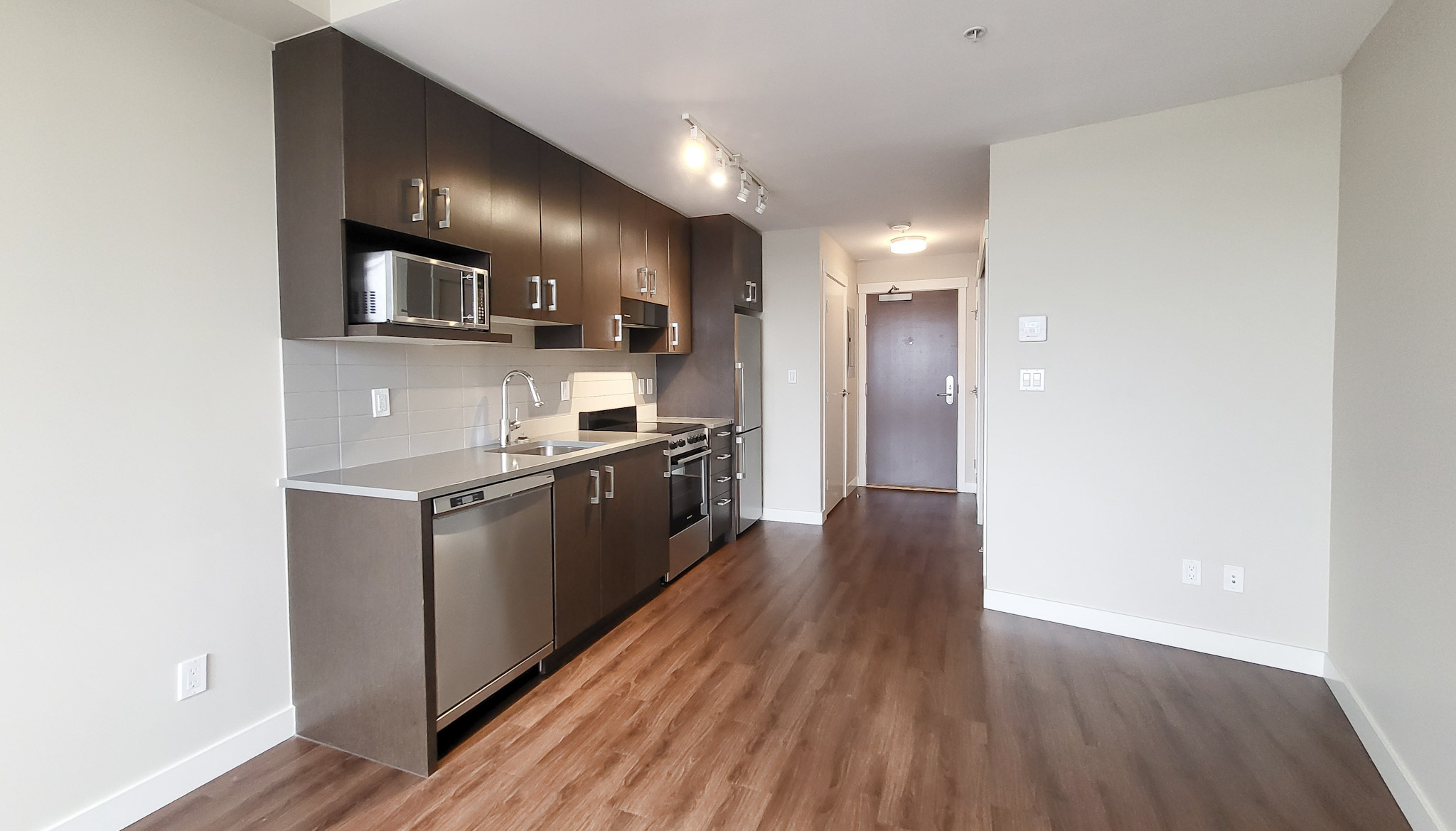 Our A plan is a bright and sunny corner suite. With large, wrap-around windows, this suite looks north and east. This 502sqft home has a large bedroom which easily fits a bed of any size, and has plush carpet. A galley kitchen features stainless-steel appliances including a dishwasher & microwave. This home is finished with low-flow faucets, LED lights and other amazing eco-friendly solutions, meaning you can feel good about reducing your carbon footprint.