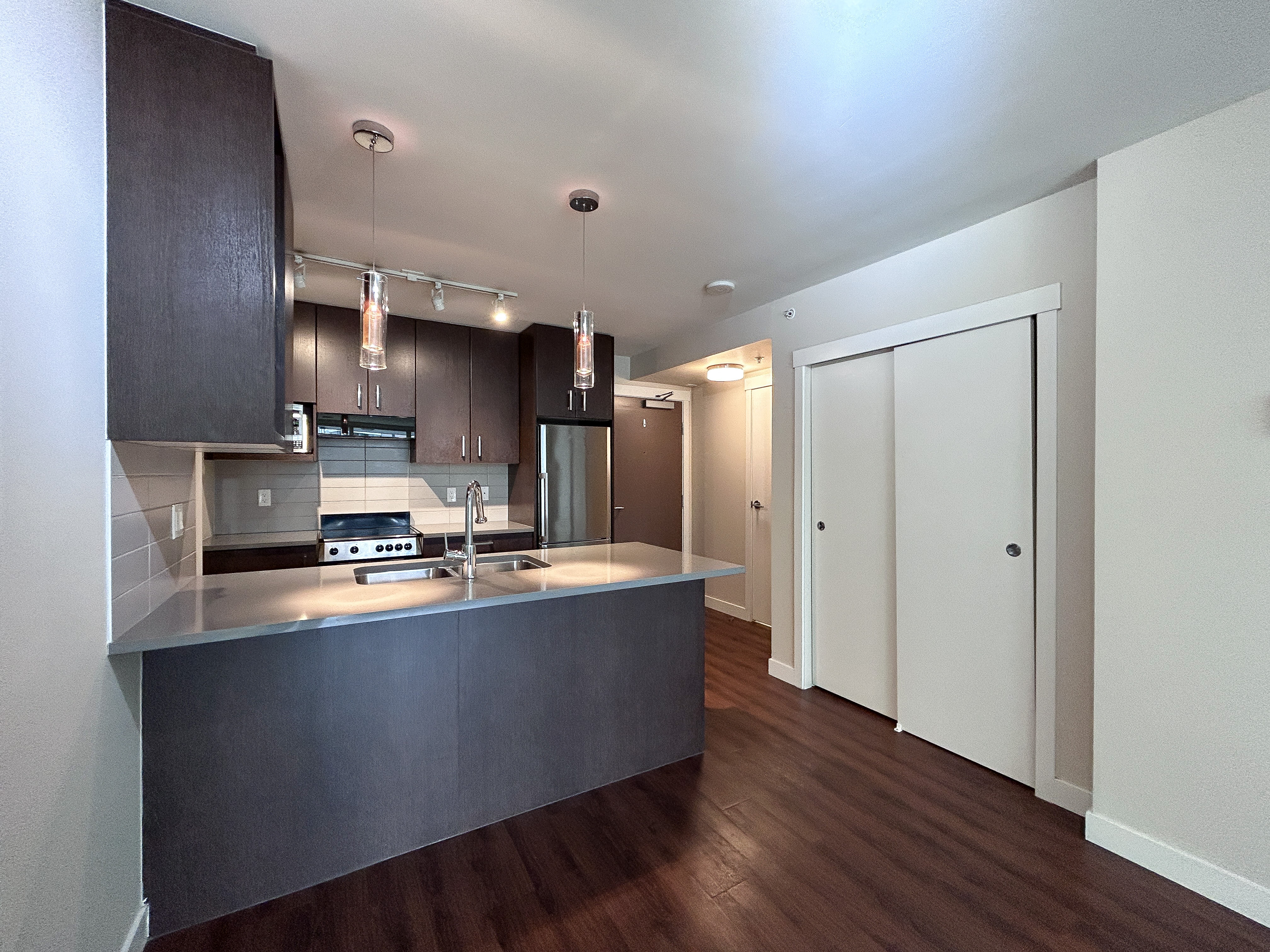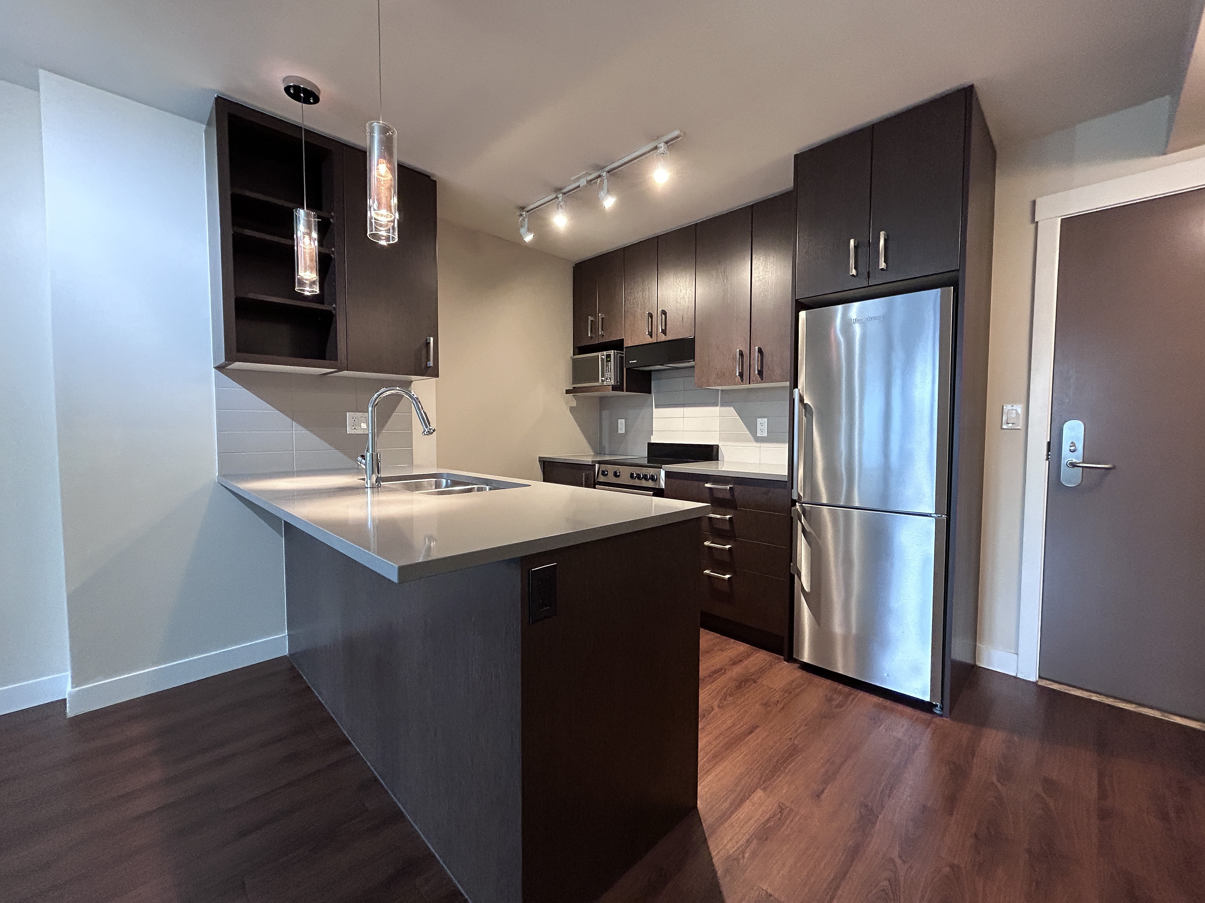 Our E plan is most favourable. With large balconies and terraces, this home offers plenty of outdoor space. Facing west, this floor plan overlooks the quiet back alley, away from the bustle of the roads. With large closets, a separate laundry room and an open-concept space, this home allows for optimal organization and storage. The large kitchen island doubles as a breakfast bar, topped with beautiful quartz stone counters. This home is finished with low-flow faucets, LED lights and other amazing eco-friendly solutions, meaning you can feel good about reducing your carbon footprint.