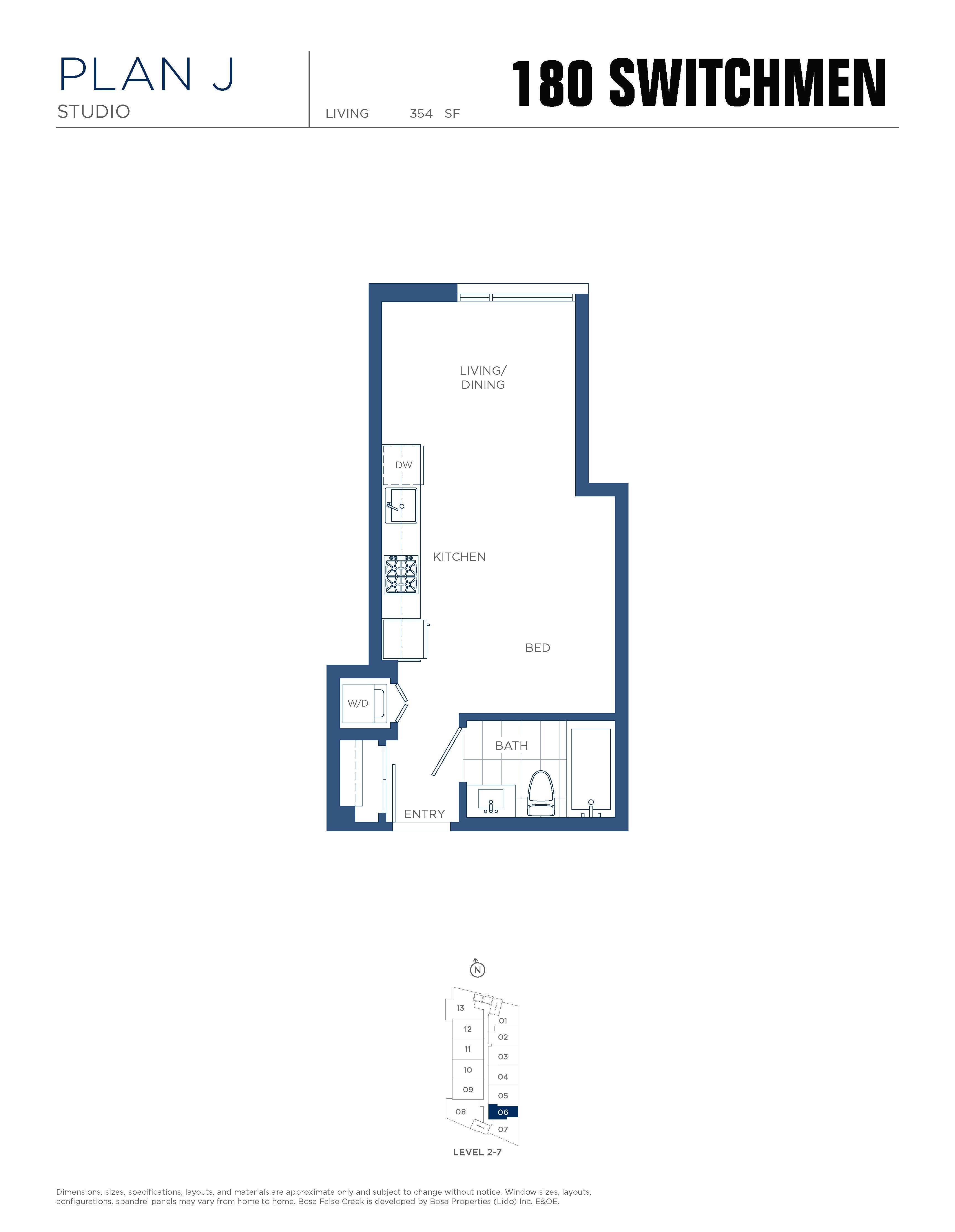 Our J plan is our 345sqft studio. Located on the east side of the building, this home faces toward Main Street. This is an open concept bachelor suite, a great solution for students. A galley kitchen features stainless-steel appliances including a dishwasher & microwave. This home is finished with low-flow faucets, LED lights and other amazing eco-friendly solutions, meaning you can feel good about reducing your carbon footprint.