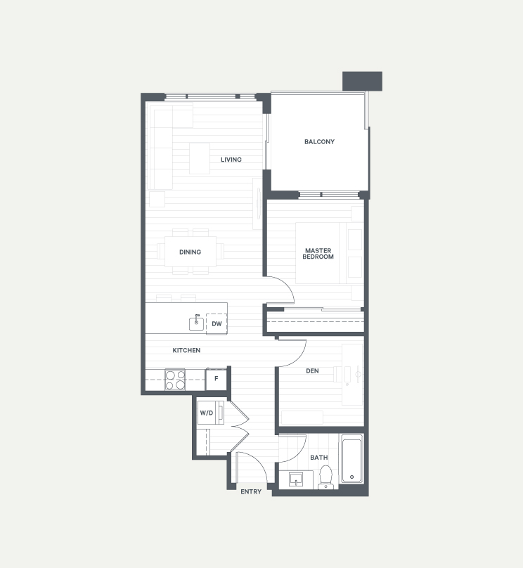 Our largest 1 bedroom + den plan, C18, is 700sqft of pure functional space. The large den doubles as an office, walk-in closet, nursery and beyond. Located on the west corner, this home promised gorgeous natural light every afternoon. The deep balcony provides a private outdoor space to enjoy the sunset. The kitchen includes stainless steel appliances and finishes, along with quartz counters and soft-close cabinets.