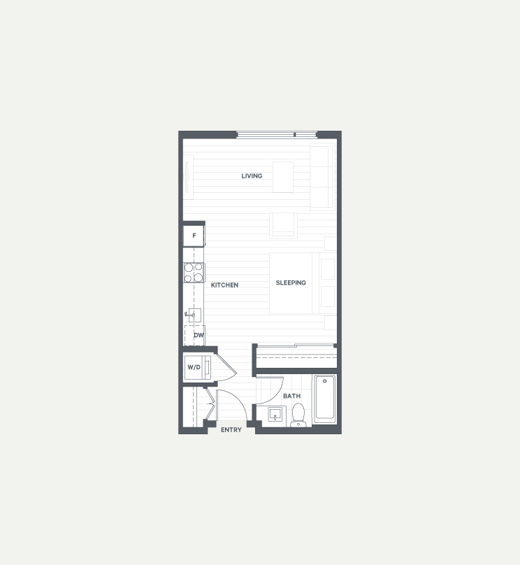 Our A3 studio is an open concept, with views overlooking 2nd floor courtyard. The northern exposure offers cool, diffuse light year-round. This 432sqft home is fitted with all the newest stainless-steel, low-energy appliances, and finished with modern grey cabinets ad flooring. Our Silver LEED equivalent standard means you can feel good about living in the neighbourhood’s greenest building.
