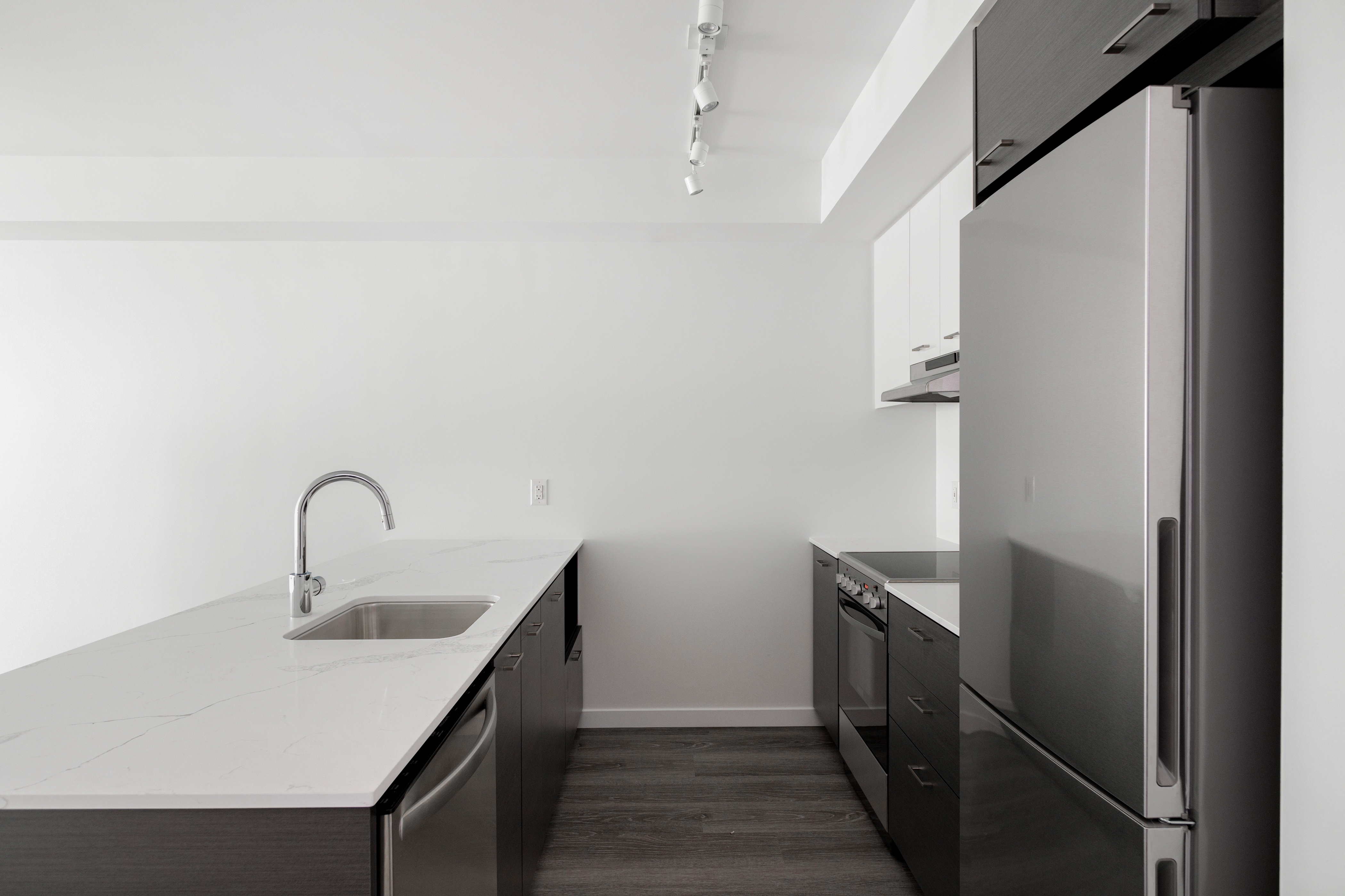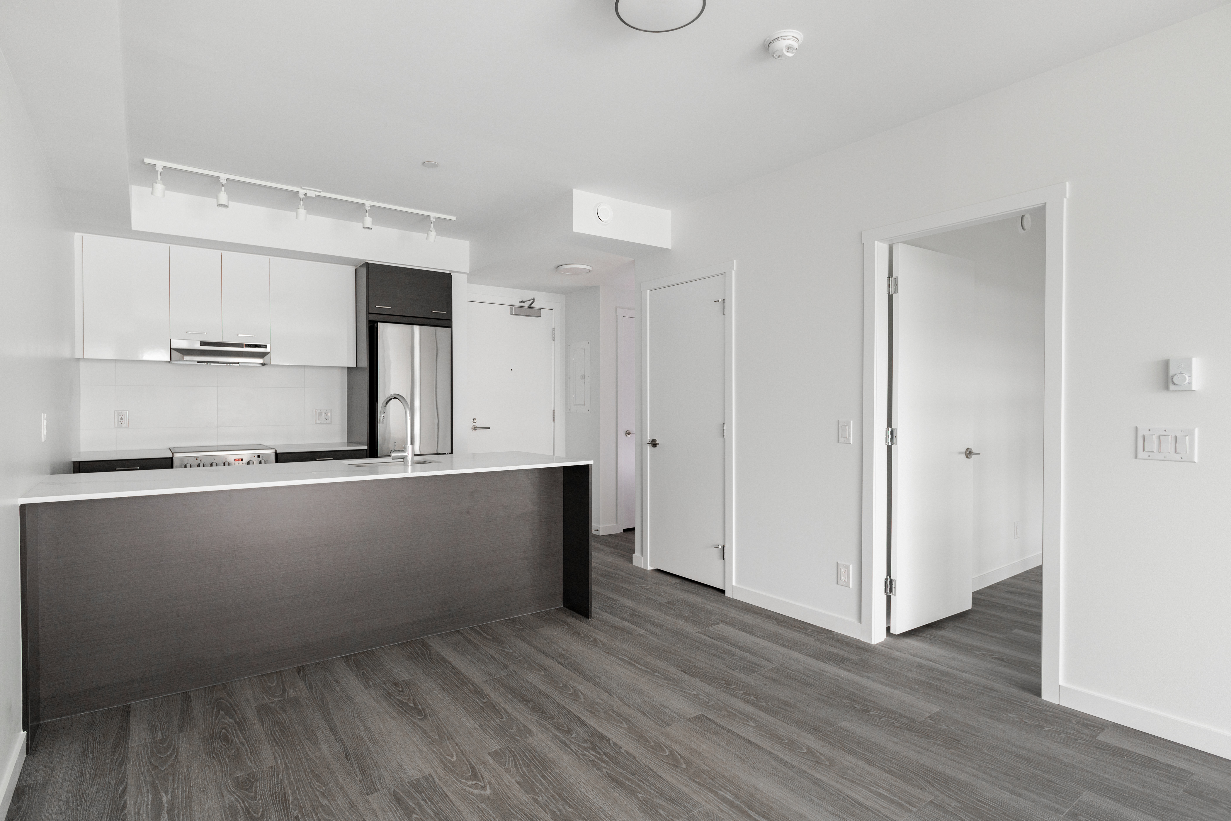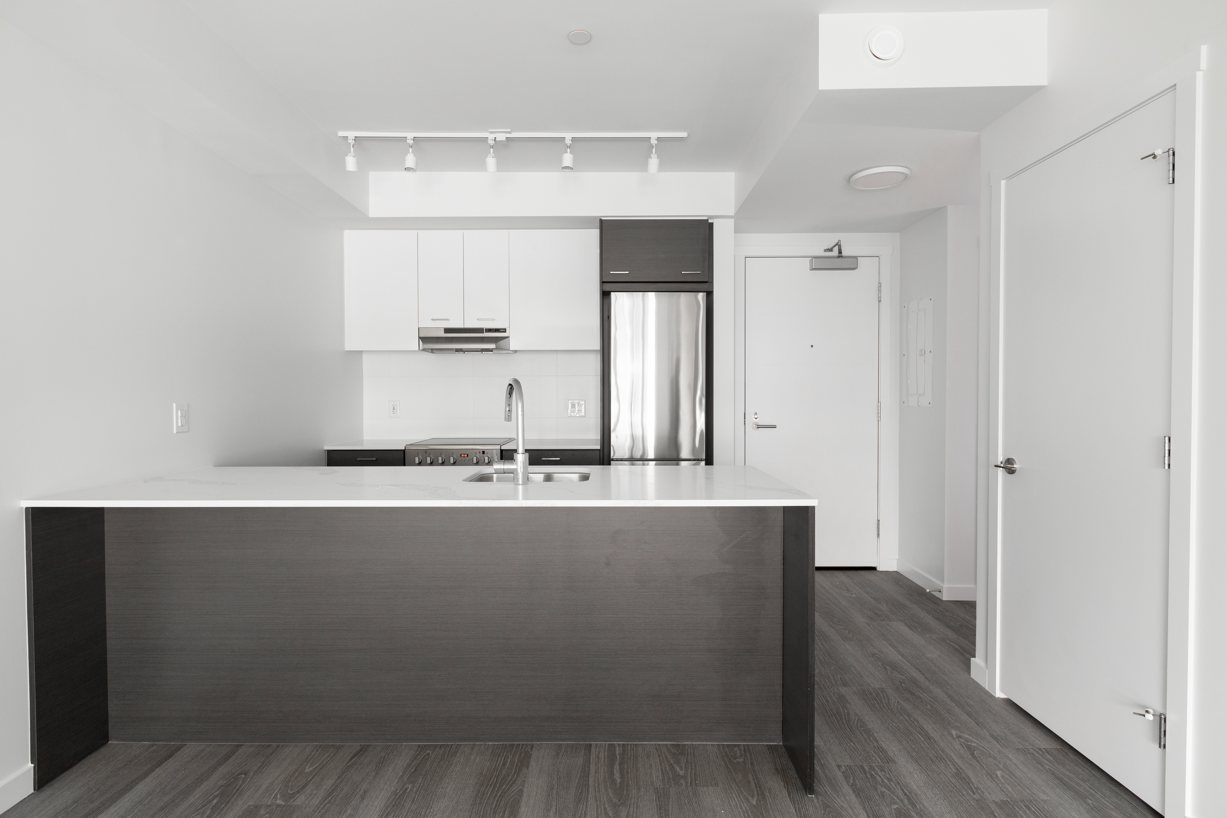 Our C1 plan is 561sqft and features a gorgeous Western exposure, with quaint views overlooking our resident’s courtyard. The large kitchen island doubles as a breakfast bar and is topped with beautiful quartz counters. Modern and efficient finishes include low-energy, stainless-steel appliances, low-flow faucets and in-suite laundry. High-quality vinyl plank floors fill the suite for a clean and modern finish.
