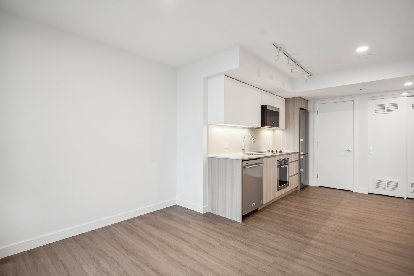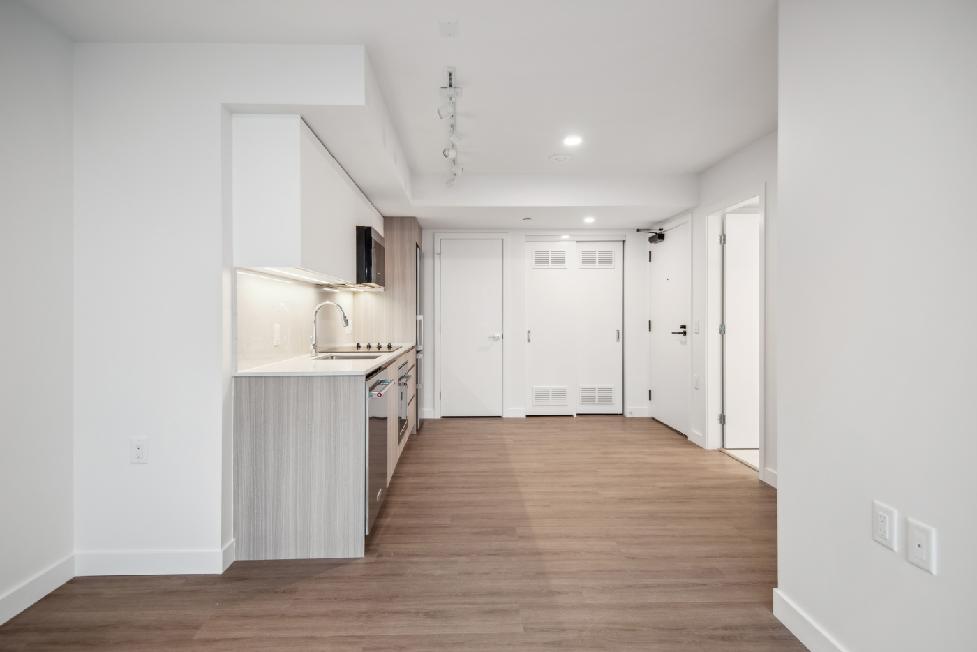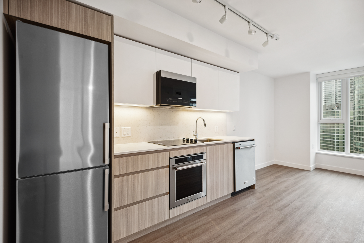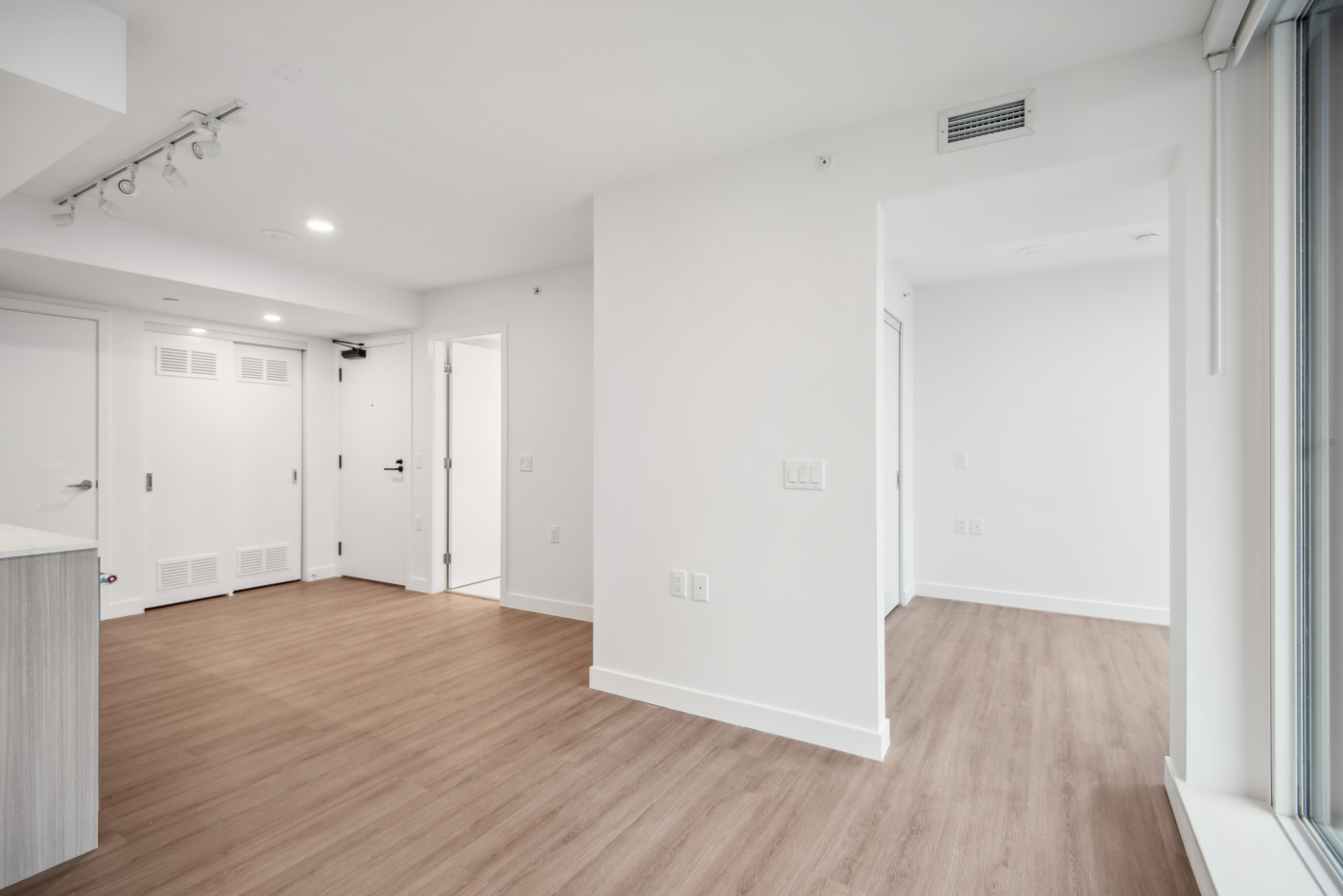 A functional junior one-bedroom with a defined sleeping area. Situated on levels 13-24, the plan is oriented to maximize functionality, with a pantry for extra storage, and an efficient flow from the entry through the living area and balcony.