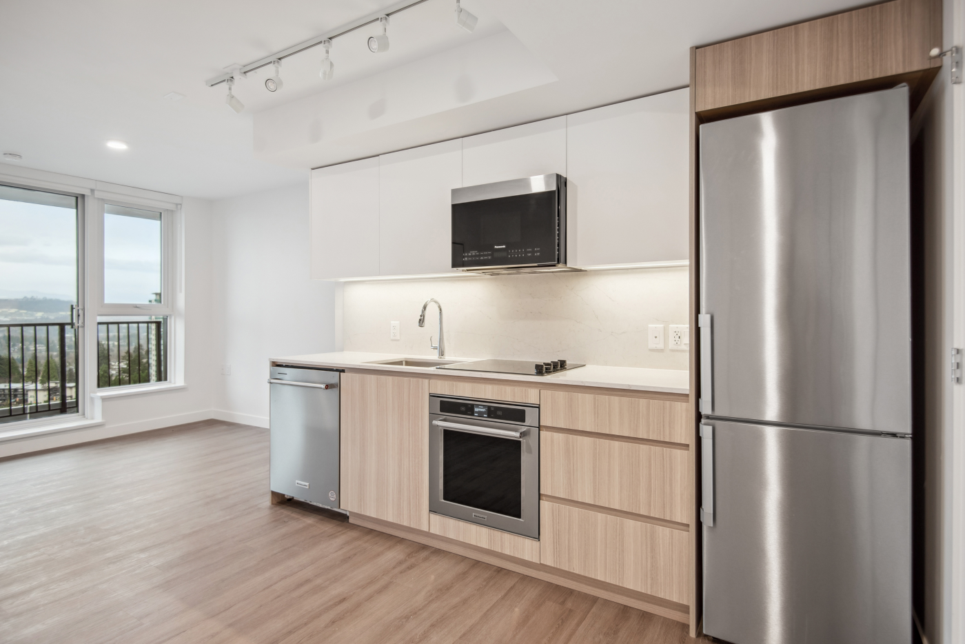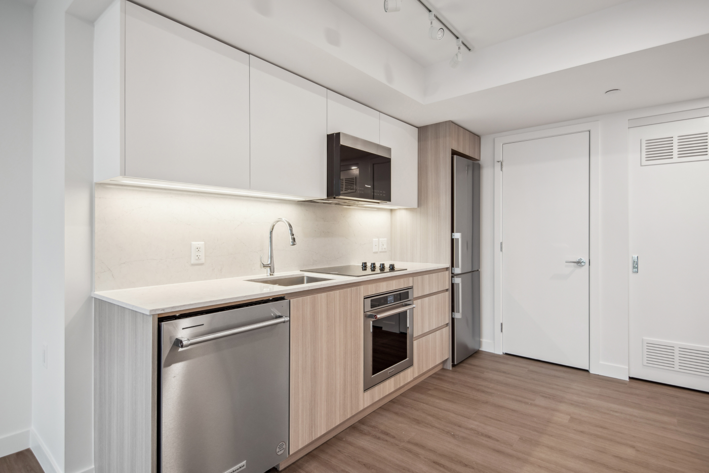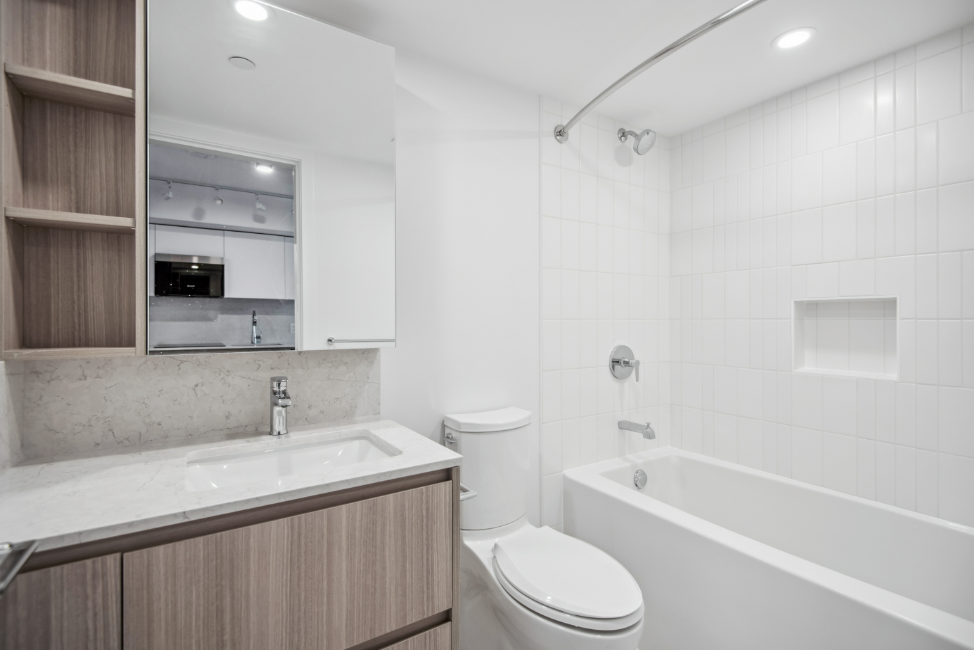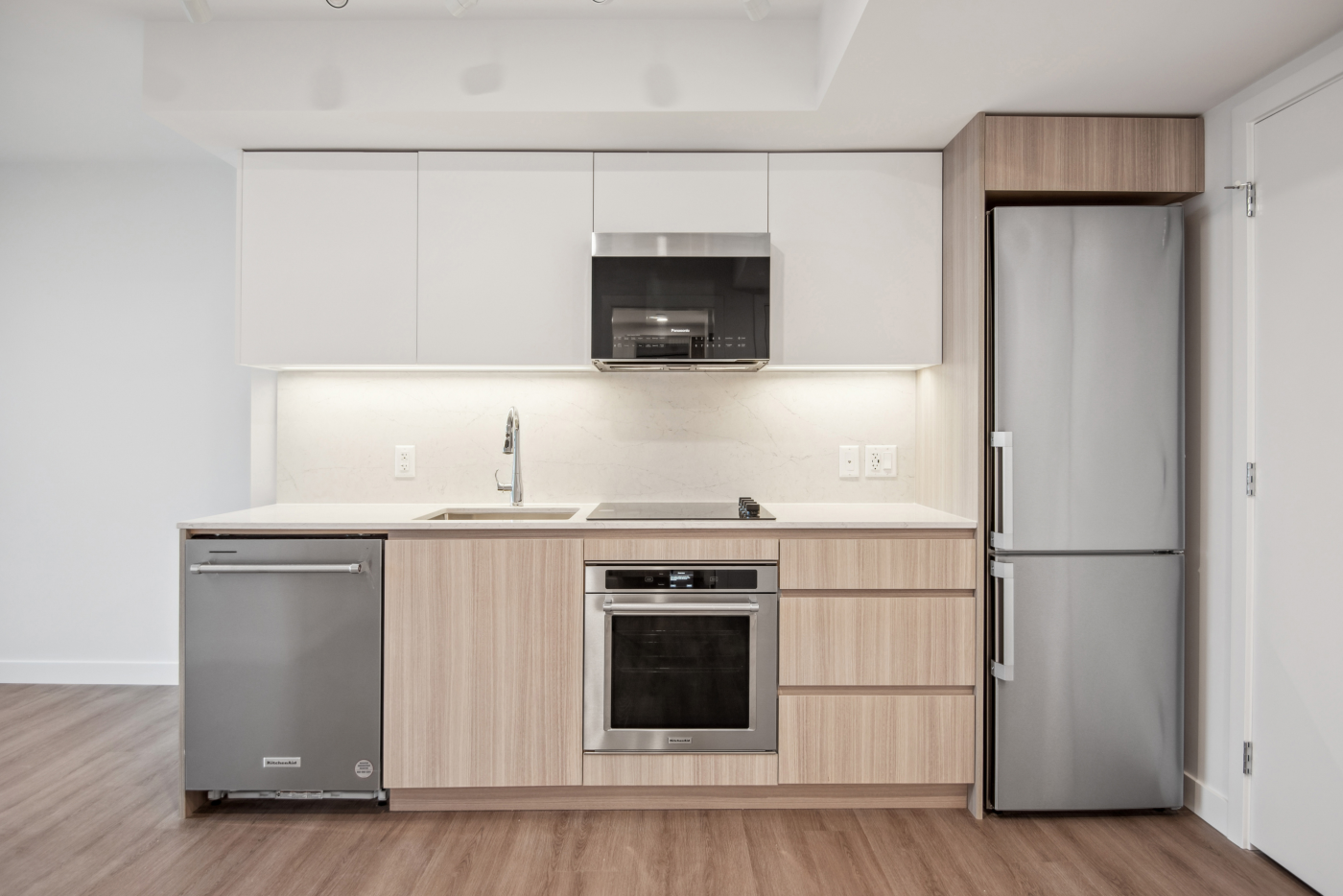 A functional junior one-bedroom with a defined sleeping area. Situated on levels 13-24, the plan is oriented to maximize functionality, with a pantry for extra storage, and an efficient flow from the entry through the living area and balcony.