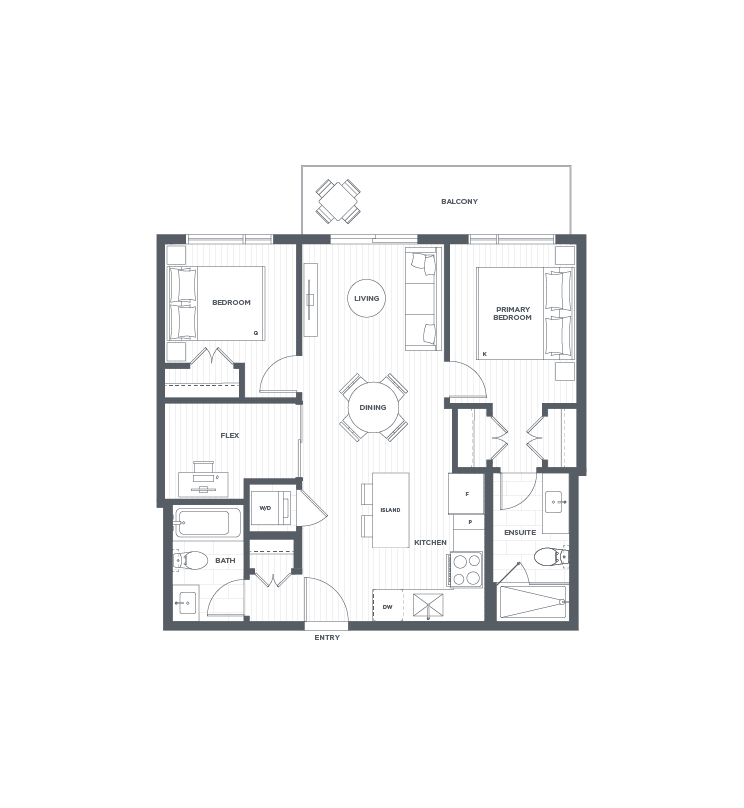 With balconies on two sides, this plan brings in mountain views from more than one direction. The primary bedroom includes an ensuite and walk-in closet, while the flex space adds valuable versatility. Air conditioning, in-suite laundry, and modern appliances complete the home.