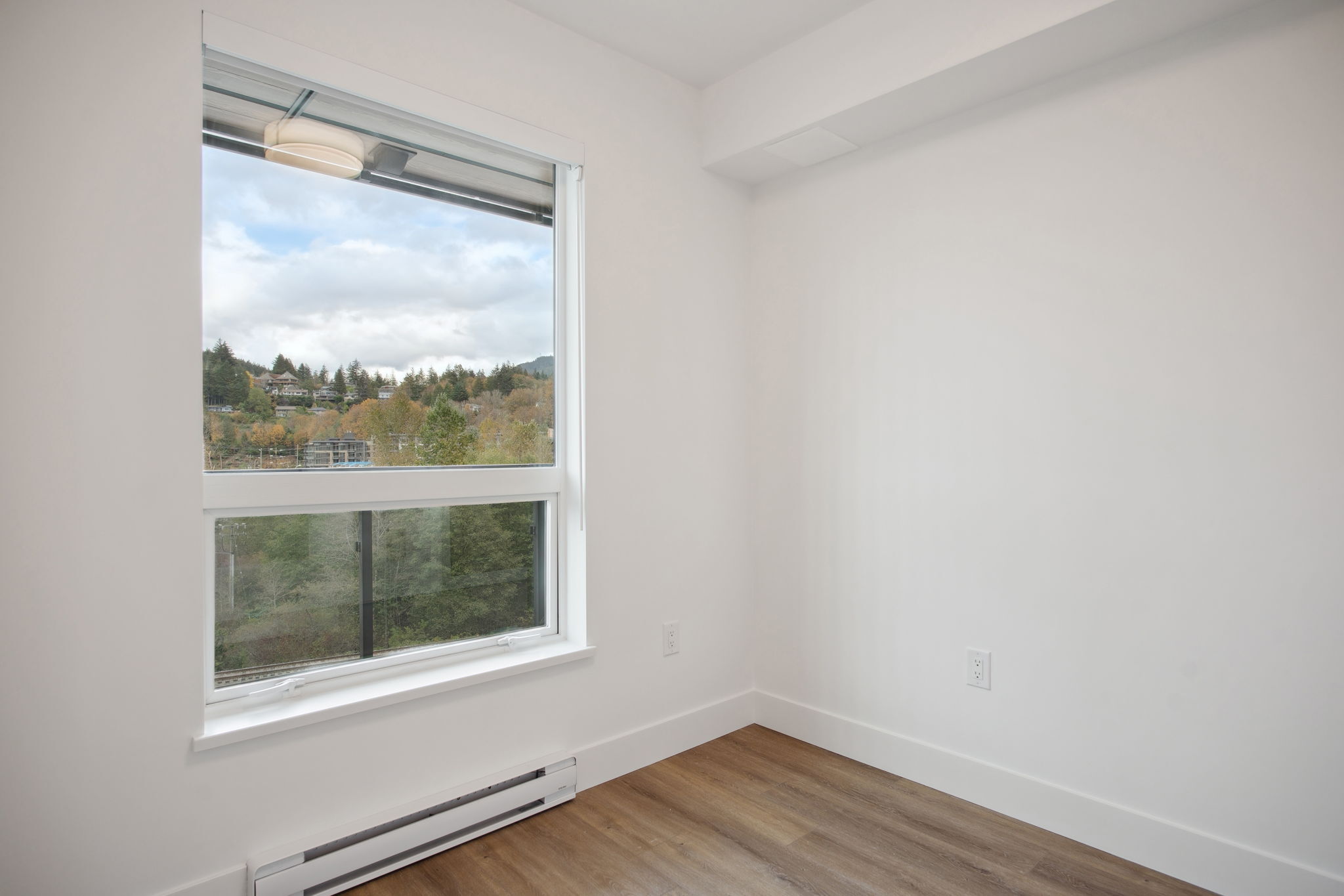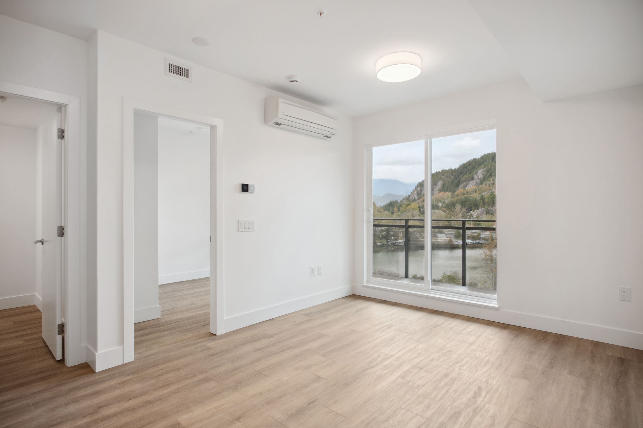 An efficient plan with the added bonus of a flex room for work or storage. The living area extends toward the balcony, where windows capture mountain views. Modern appliances, air conditioning, and in-suite laundry come standard.