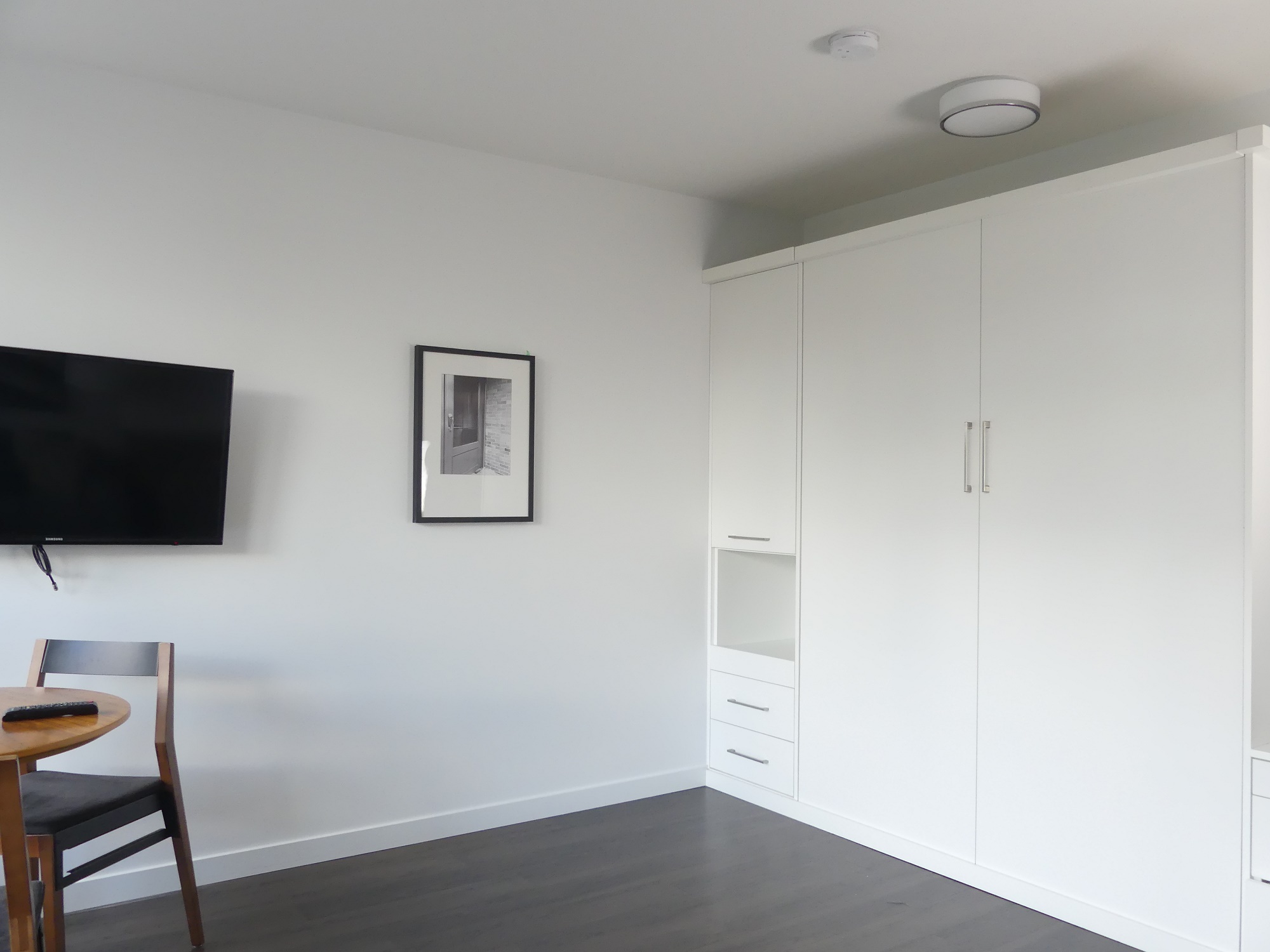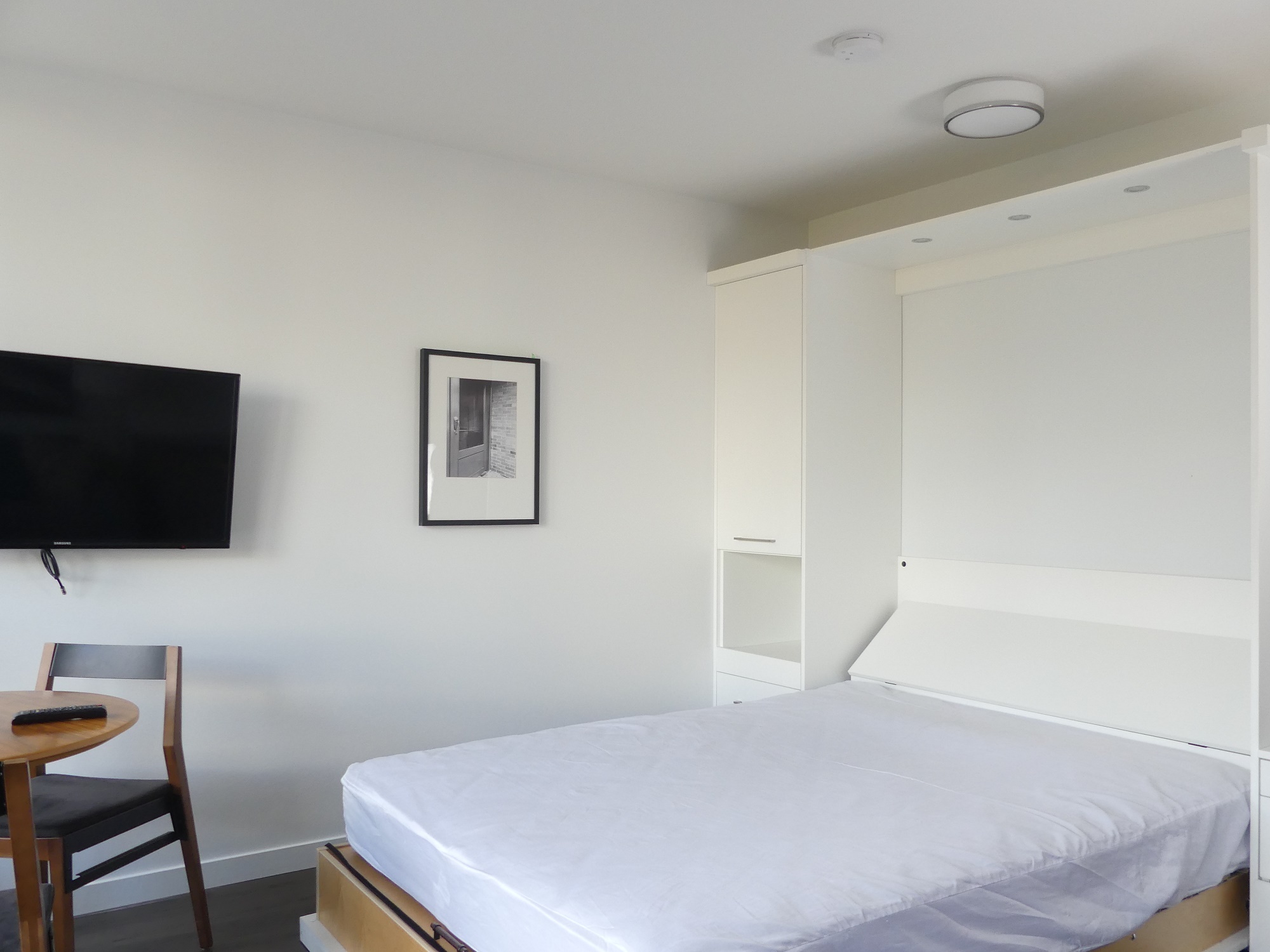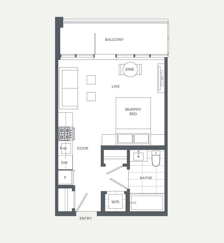 Facing East, our A1 studio plan comes semi-furnished with a Murphy bed, couch, dining table, patio table, wall-mounted television, and even an Apple TV. The suite features modern finishes including: stone countertops, vinyl plank floors and a full appliance package. Relax on the large patio, perfect for people watching below on Main Street.