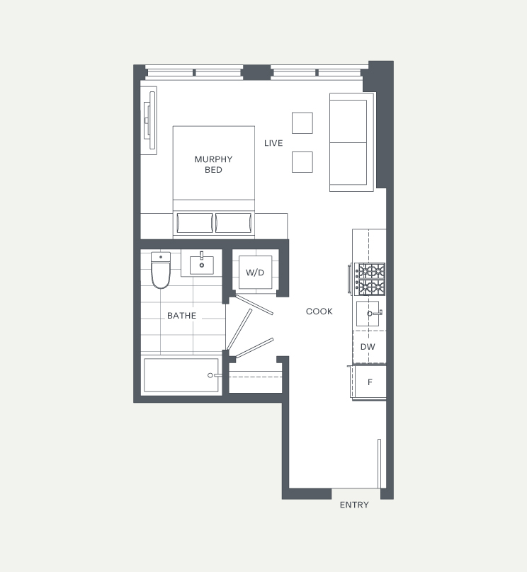 Facing East, our A2 studio plan comes with a built-in murphy bed for space saving solutions which includes storage and a table/desk. The suite features modern finishes including: stone countertops, vinyl plank floors and a full appliance package.