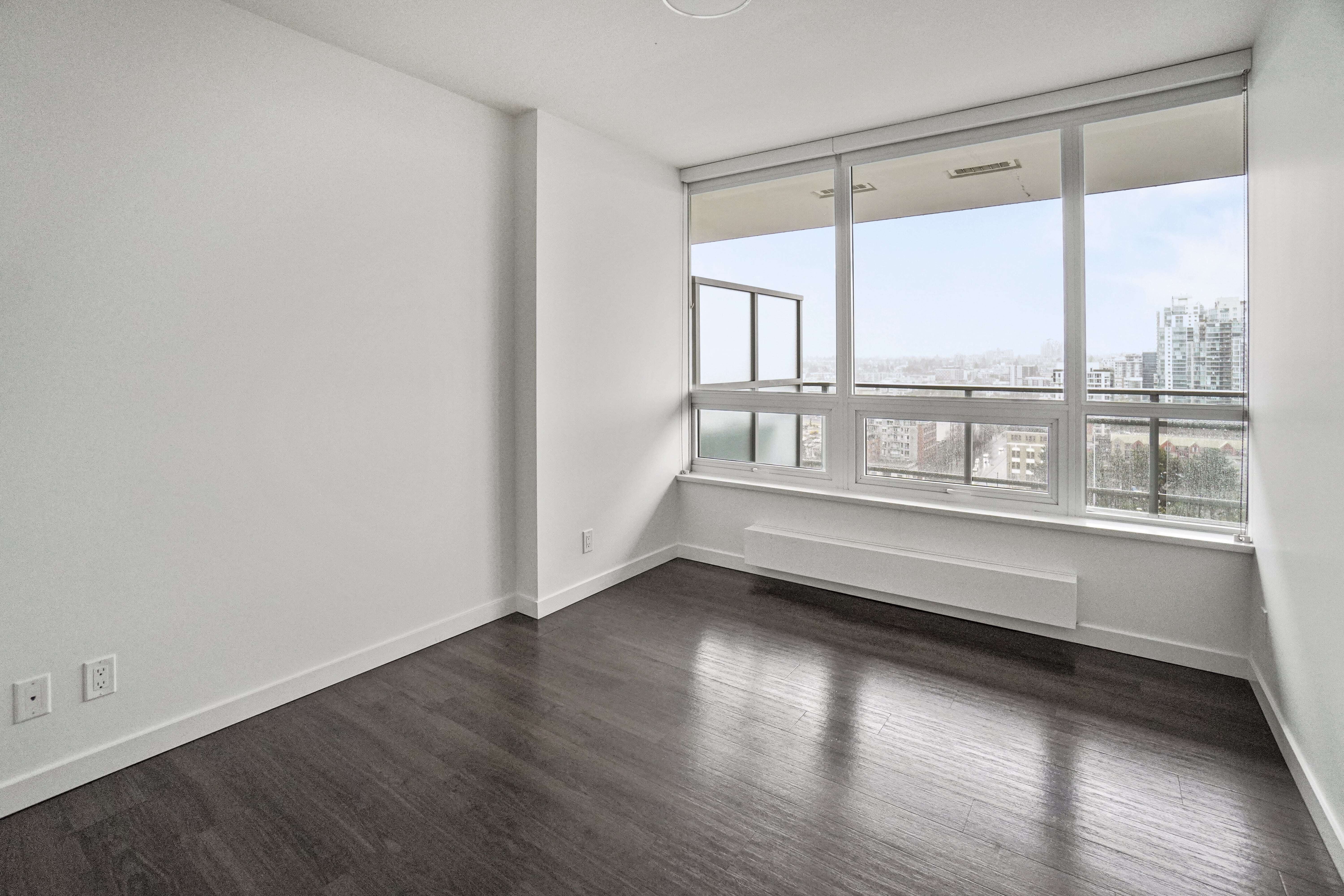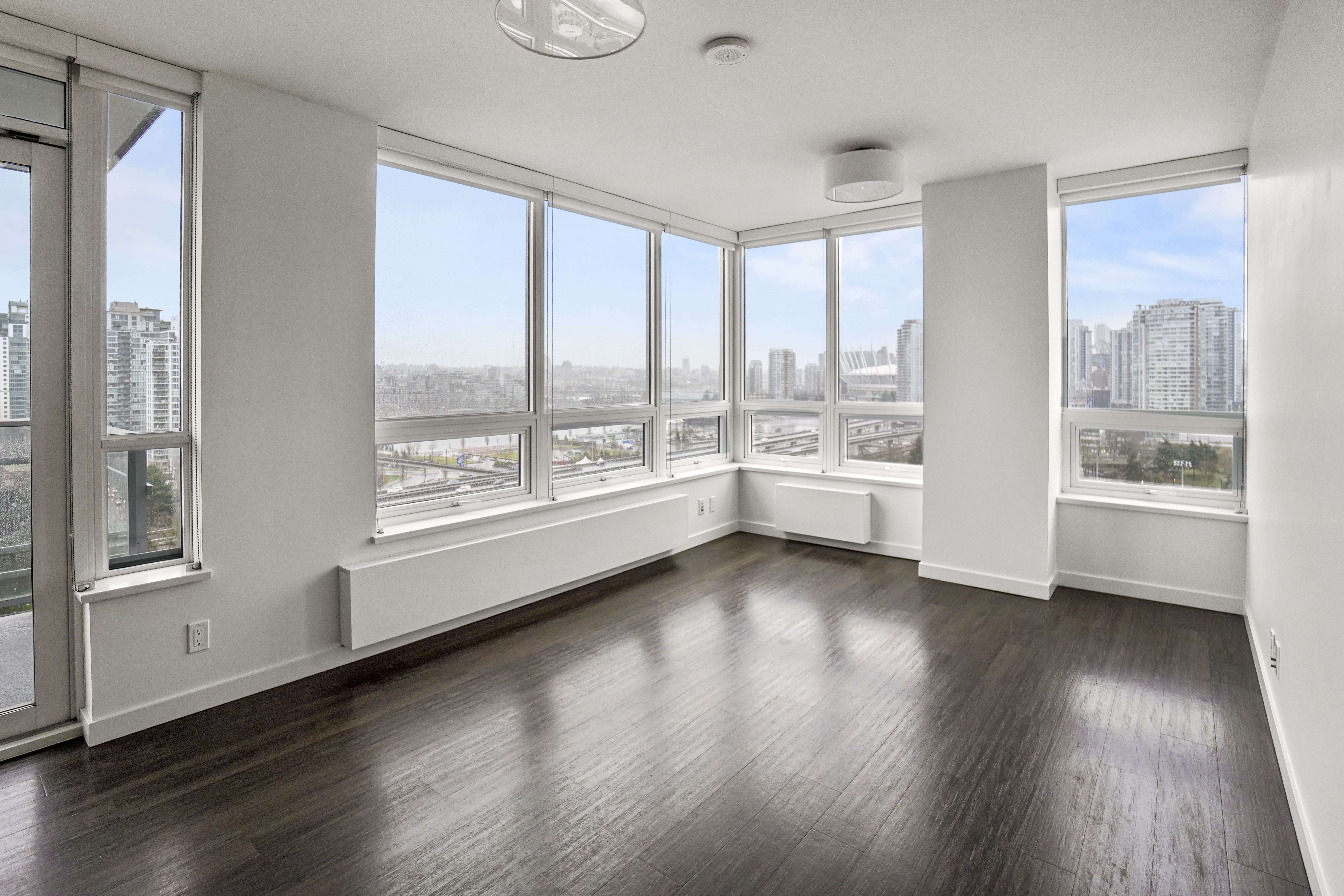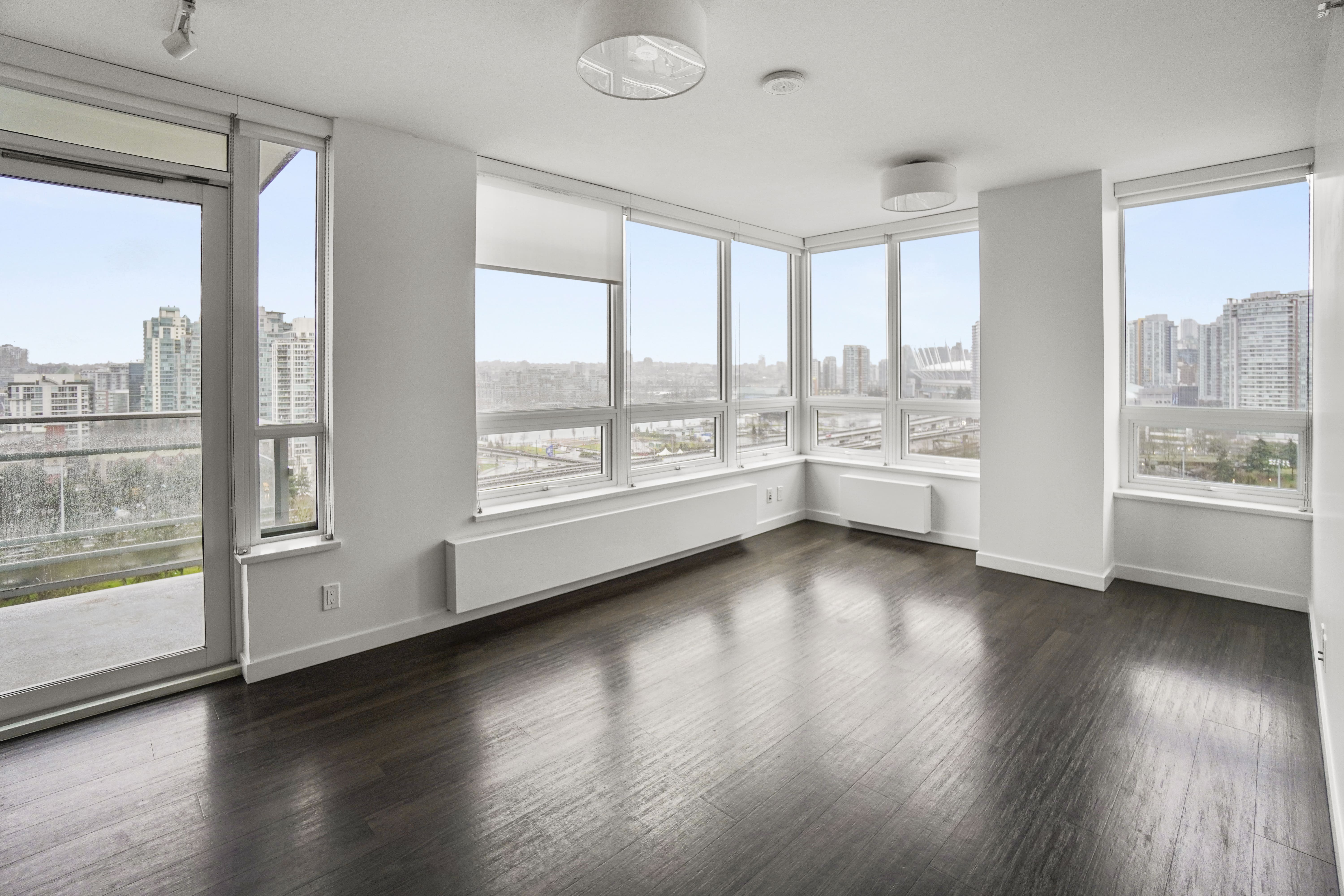 Located on the upper floors of BlueSky Chinatown, this 2BR corner suite features a bright, south-facing balcony with stunning views of False Creek and Downtown Vancouver.