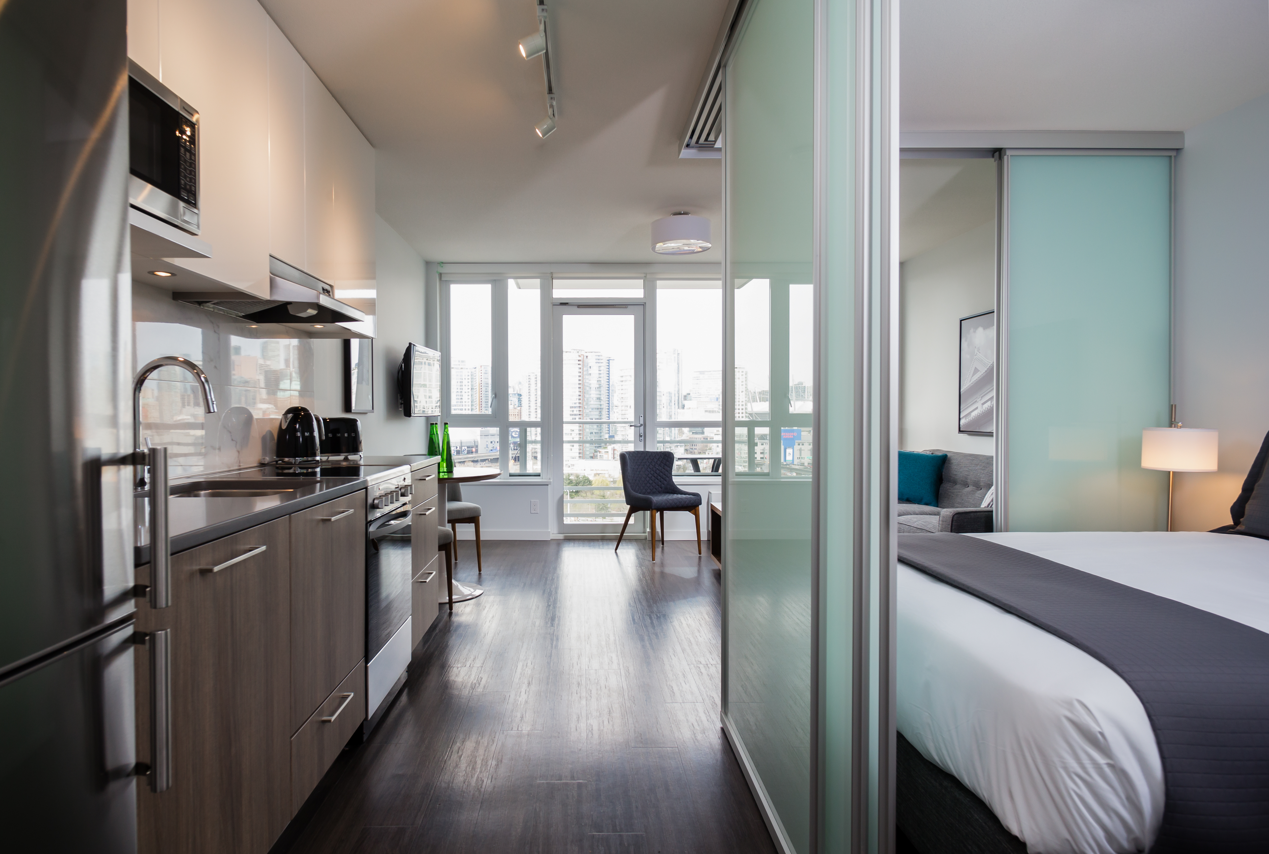 This junior 1BR and flex suite allows maximum flexibility with its separate office and transforming bedroom walls. The suite features modern finishes including: stone countertops, vinyl plank floors and a full appliance package. Relax on the west-facing balcony and take in the unbeatable views of Downtown Vancouver, the mountains, and the ocean.