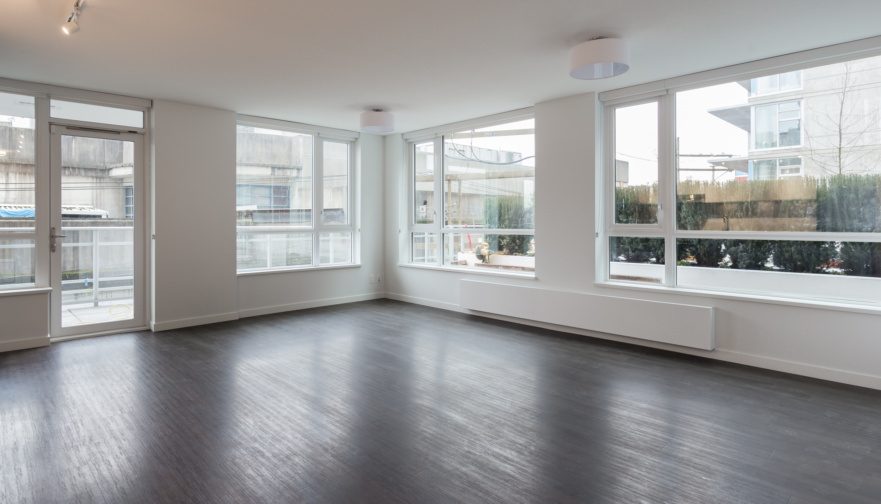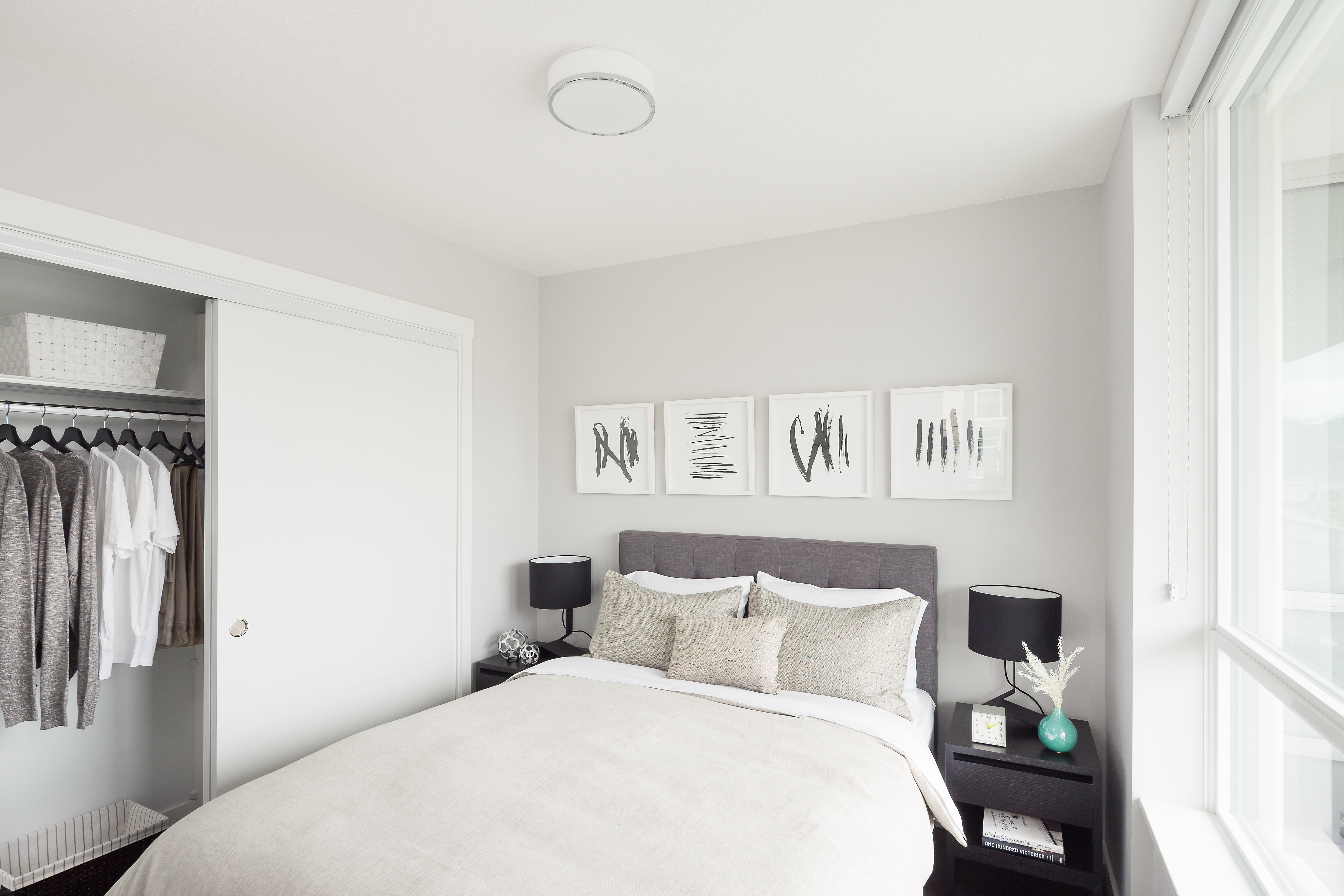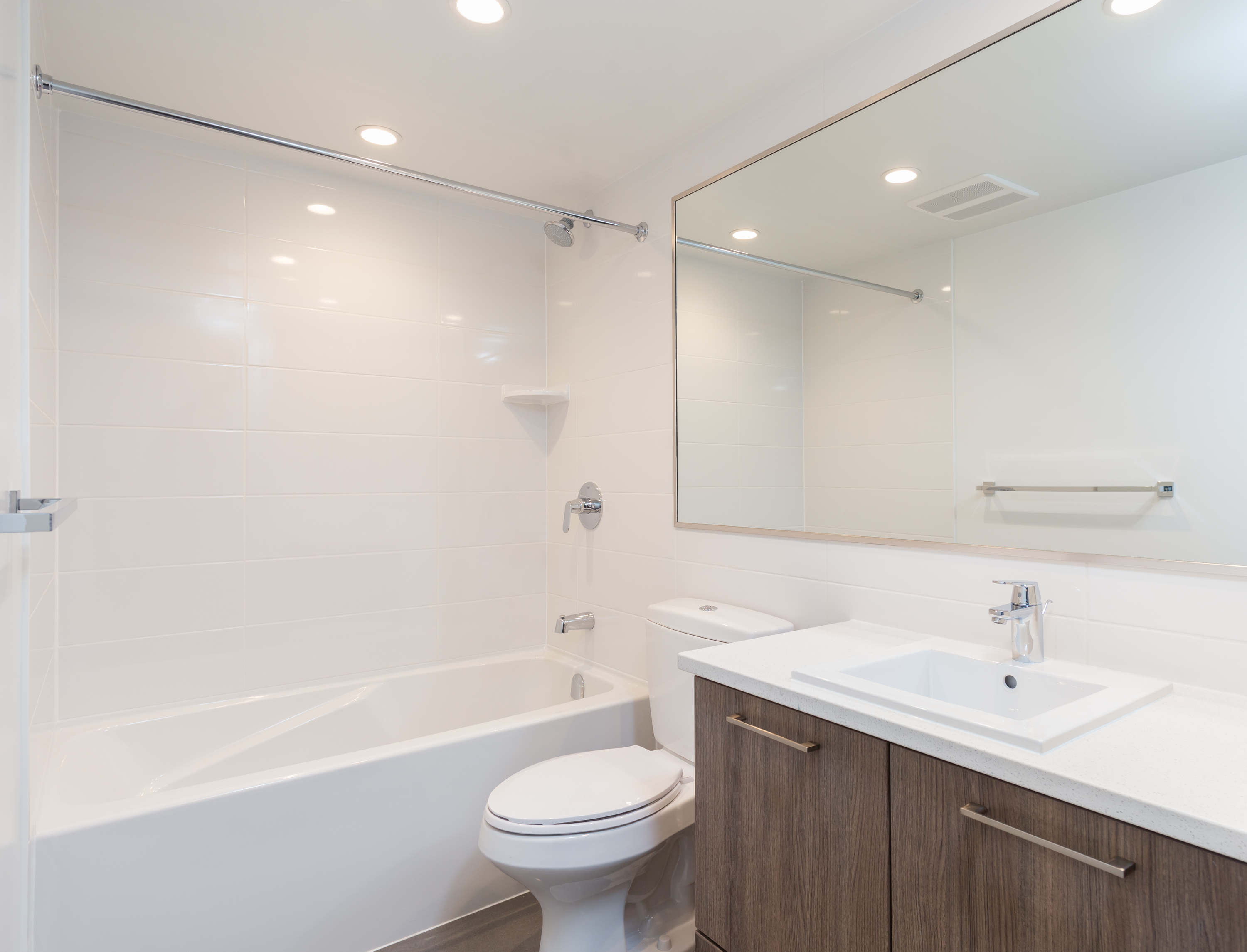 Our largest 2BR home, the D6 layout is located on the north-west corner of the building. With 2 bathrooms, a flex room, and bedrooms positioned on opposite sides, it is one of the most in-demand layouts. The suite features modern finishes including: stone countertops, vinyl plank floors and a full appliance package. Enjoy stunning views of the mountains, city, and water from the large balcony.