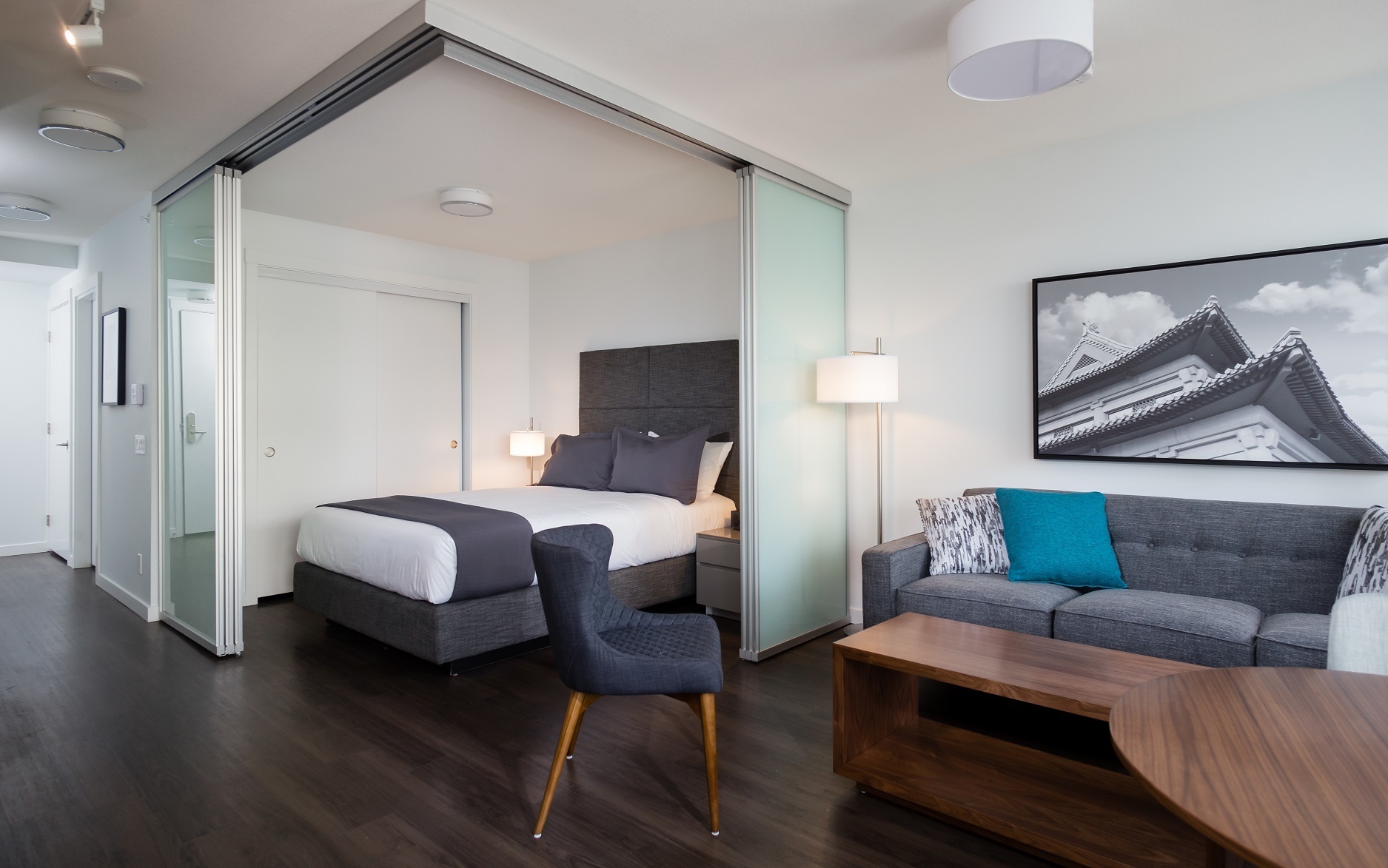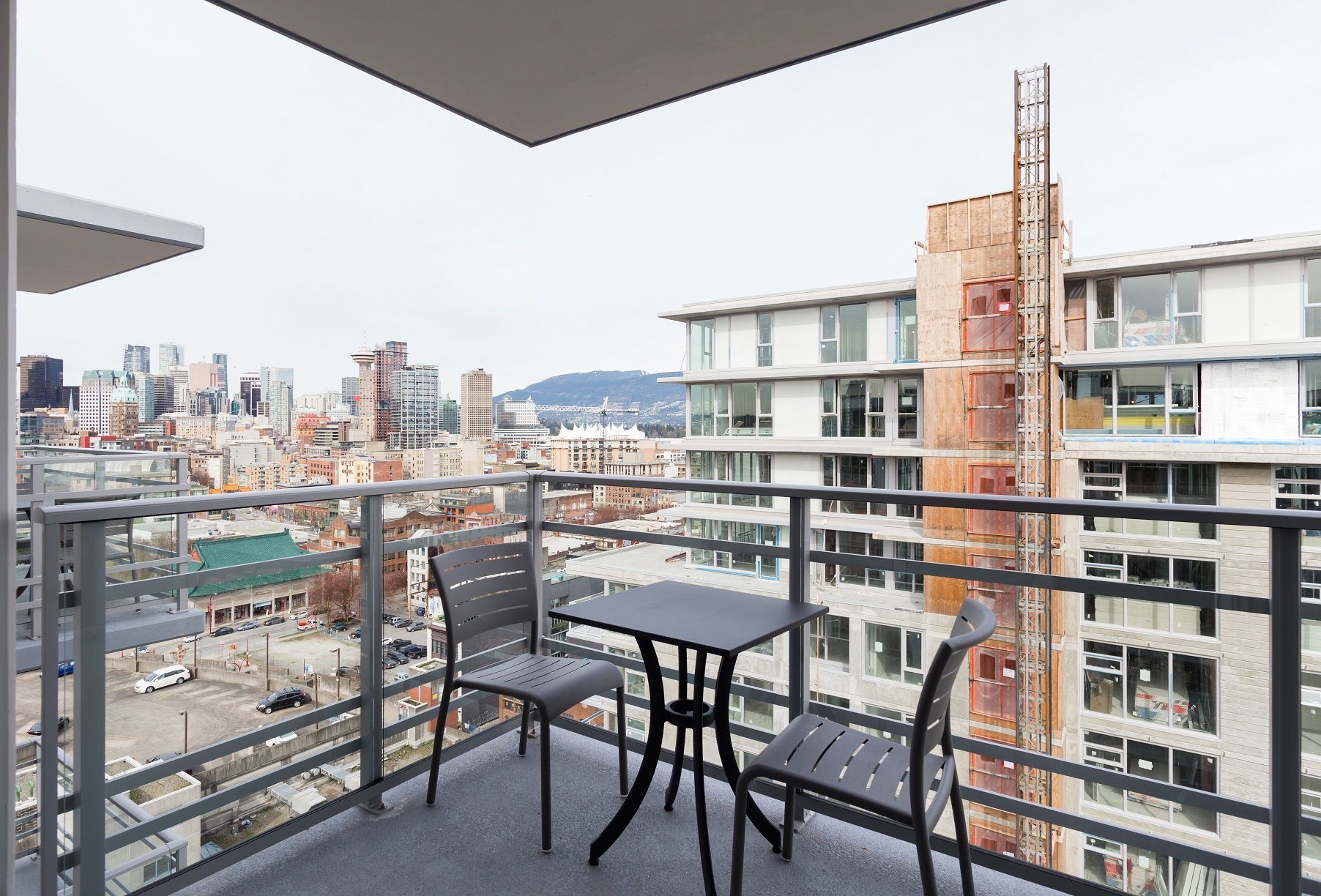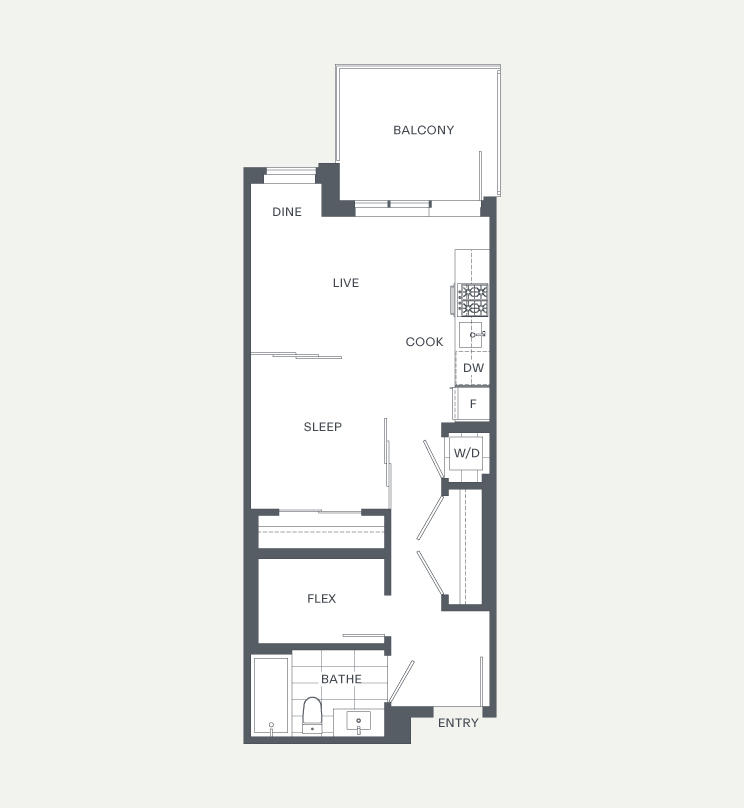 This junior 1BR allows maximum flexibility with a separate office or flex space, and transforming bedroom walls that move to fit your needs. The suite features modern finishes including: stone countertops, vinyl plank floors and a full appliance package. Relax on the balcony with views of the North Shore mountains, Downtown Vancouver, and peek-a-boo ocean views.