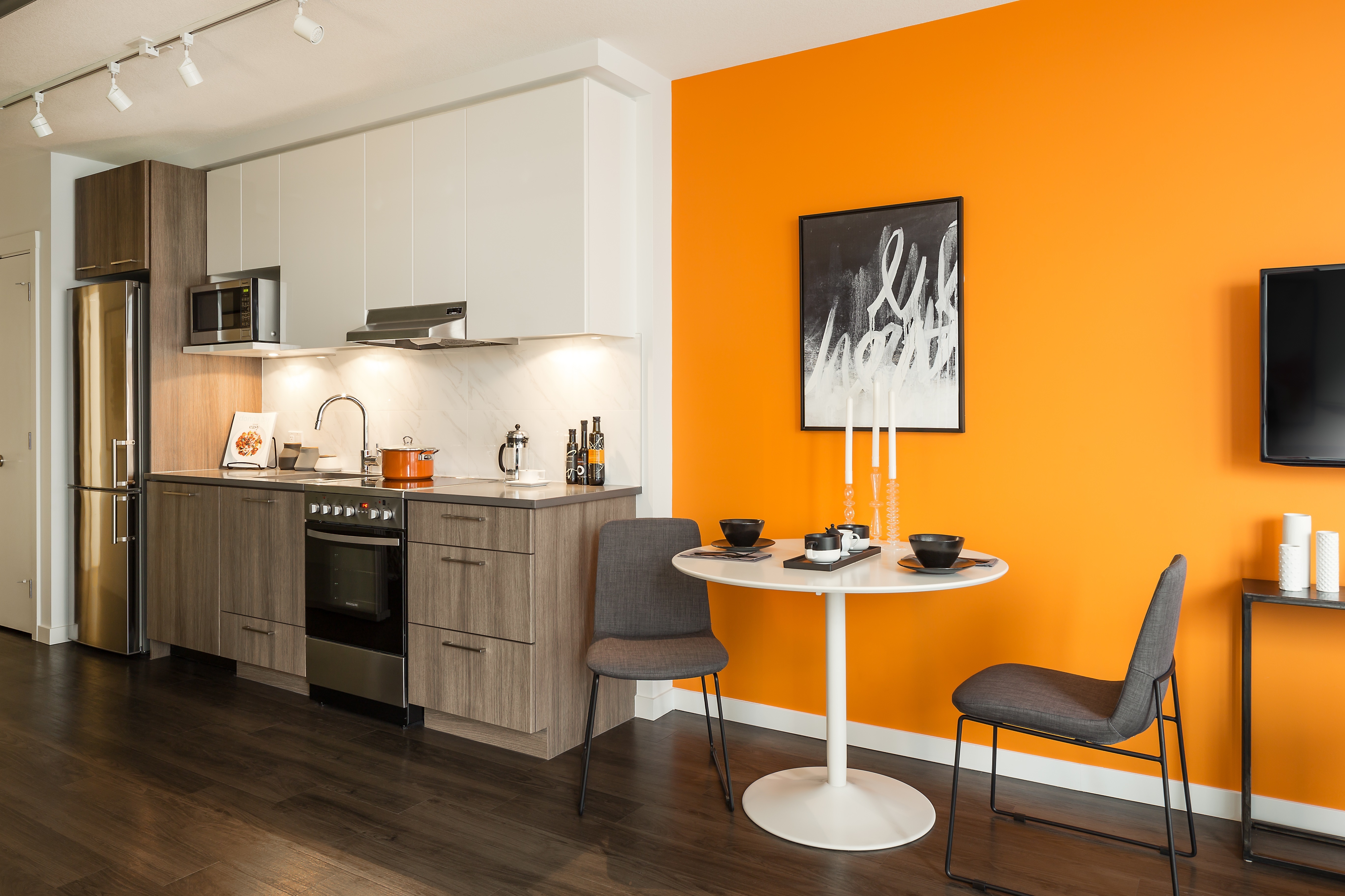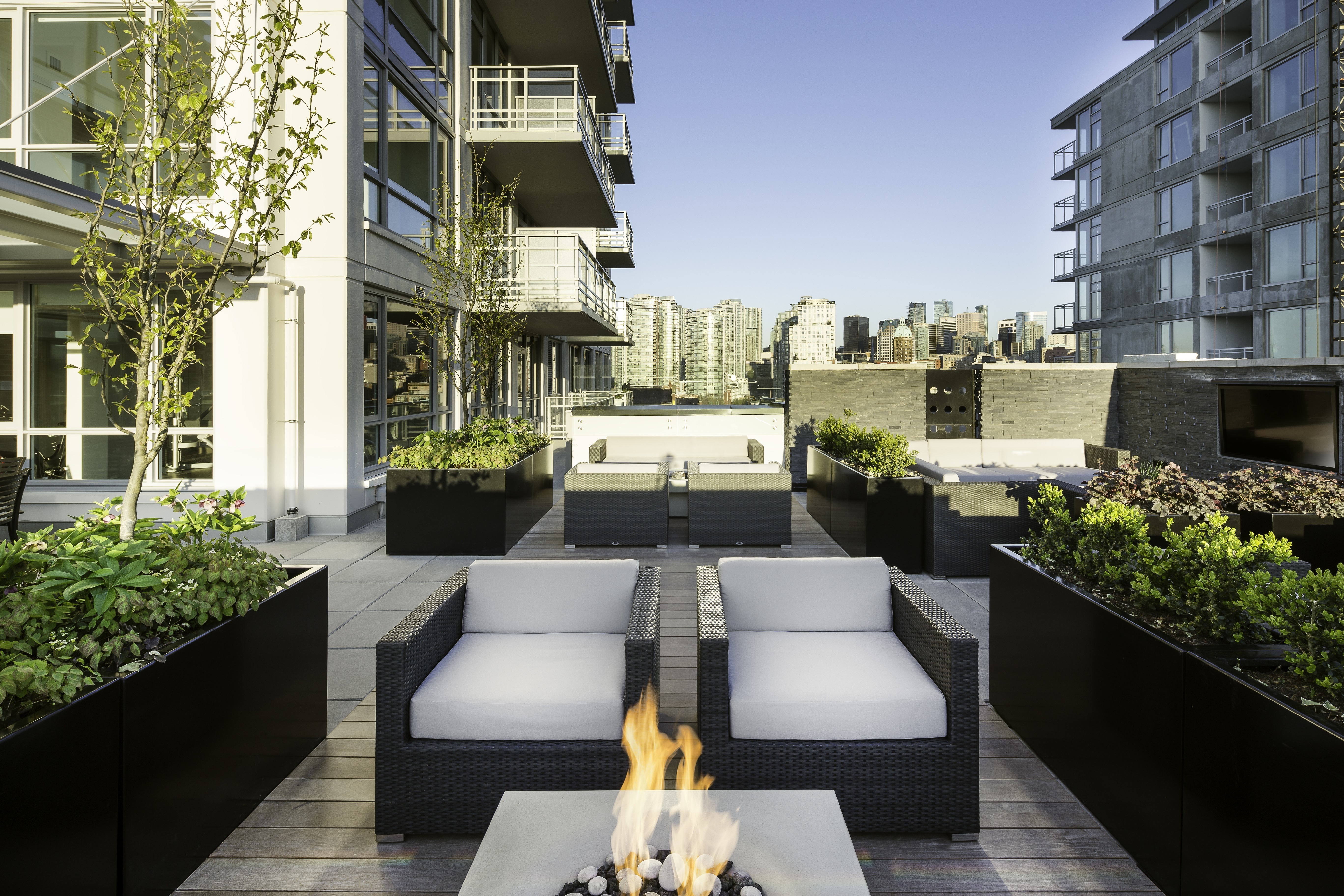 This suite allows for maximum flexibility with a separate office or flex space, and transforming walls that move to fit your needs. The suite features modern finishes including: stone countertops, vinyl plank floors and a full appliance package. Located on the north-west side of the building, this suite faces out to our tranquil 2nd floor garden level on the lower floors, and offers views of the North Shore mountains, Downtown Vancouver, and peek-a-boo ocean views on the upper floors.