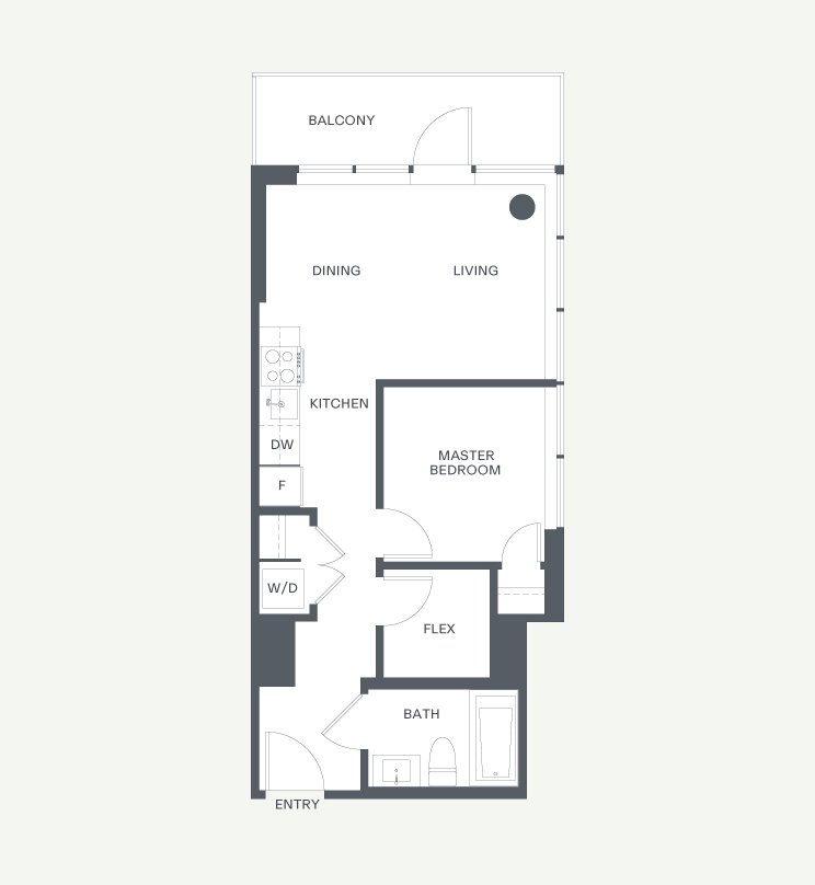 Our C9 plan is a 555sqft, brightly lit corner suite. This one-of-a-kind home features a large balcony with a southern exposure; the view perfect for people watching. The added flex room is fit with a custom storage system, expanding closet space. Modern and functional finishes complete this home.