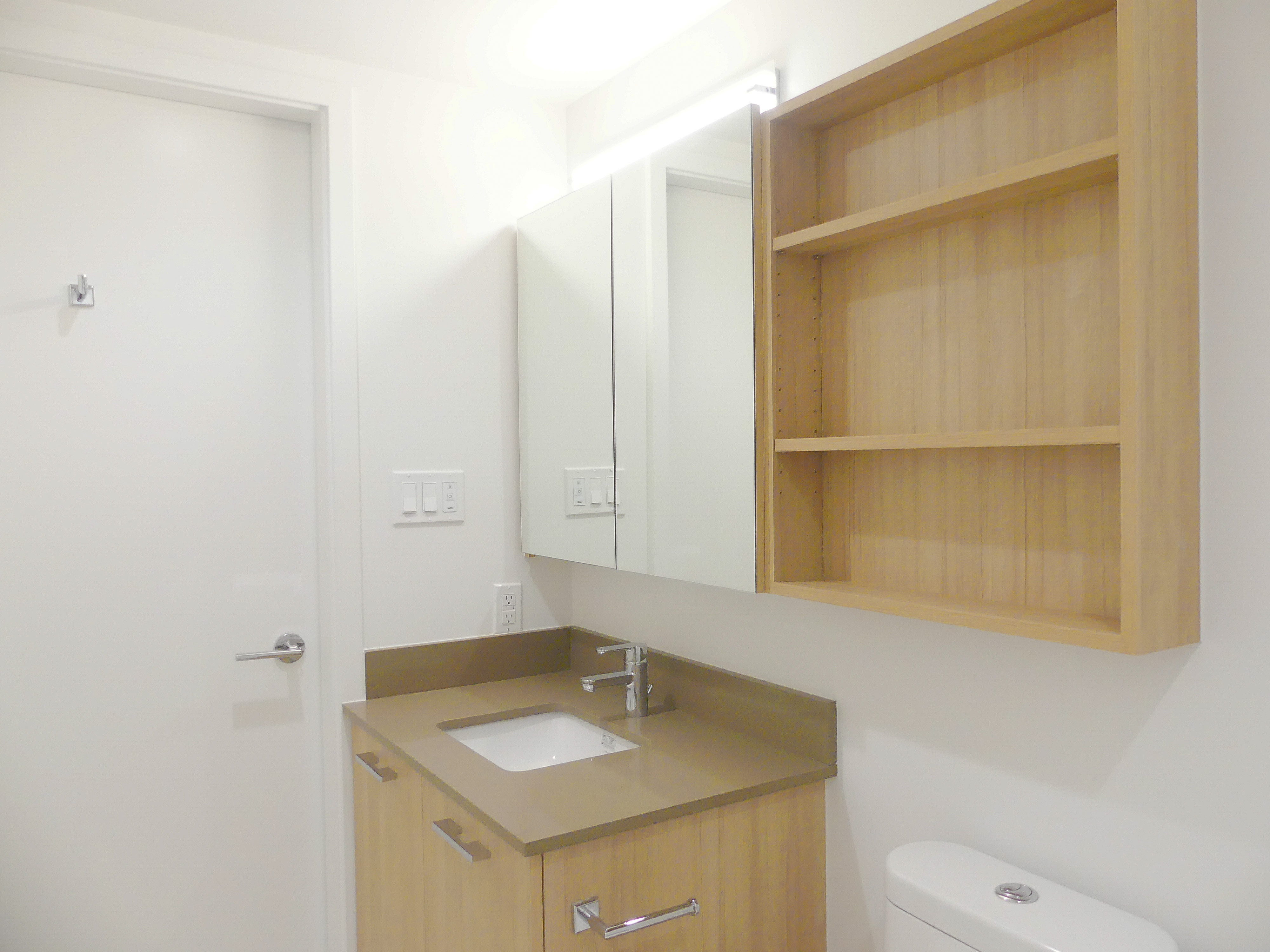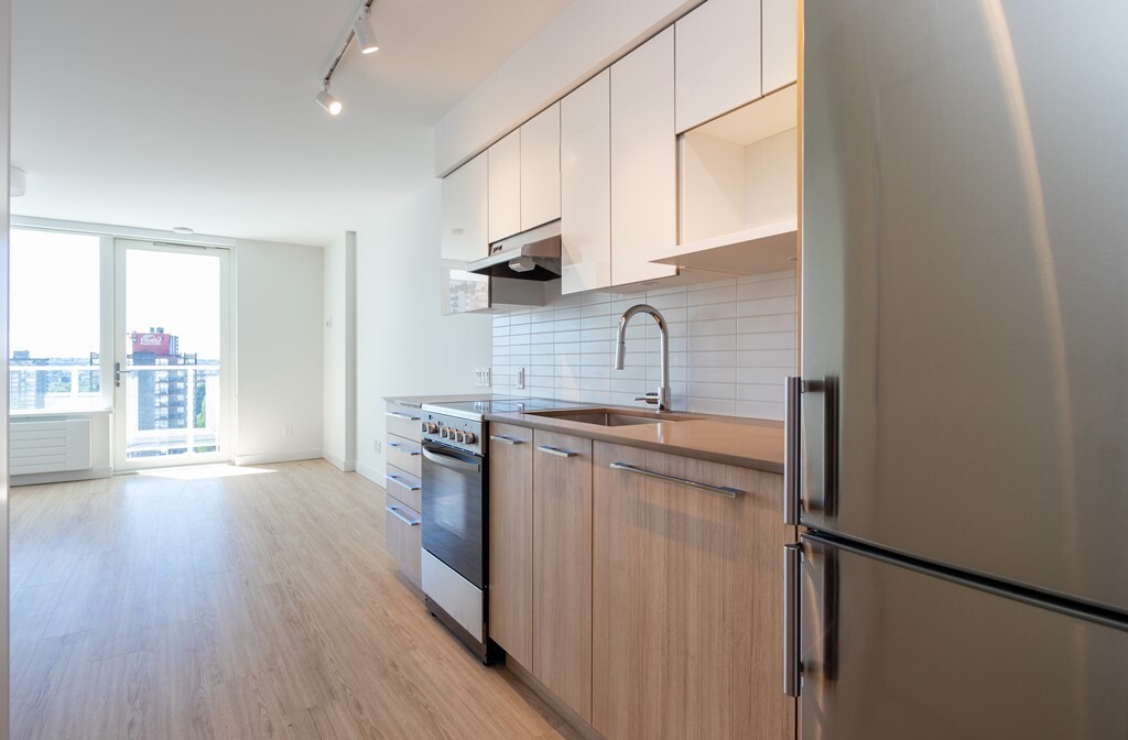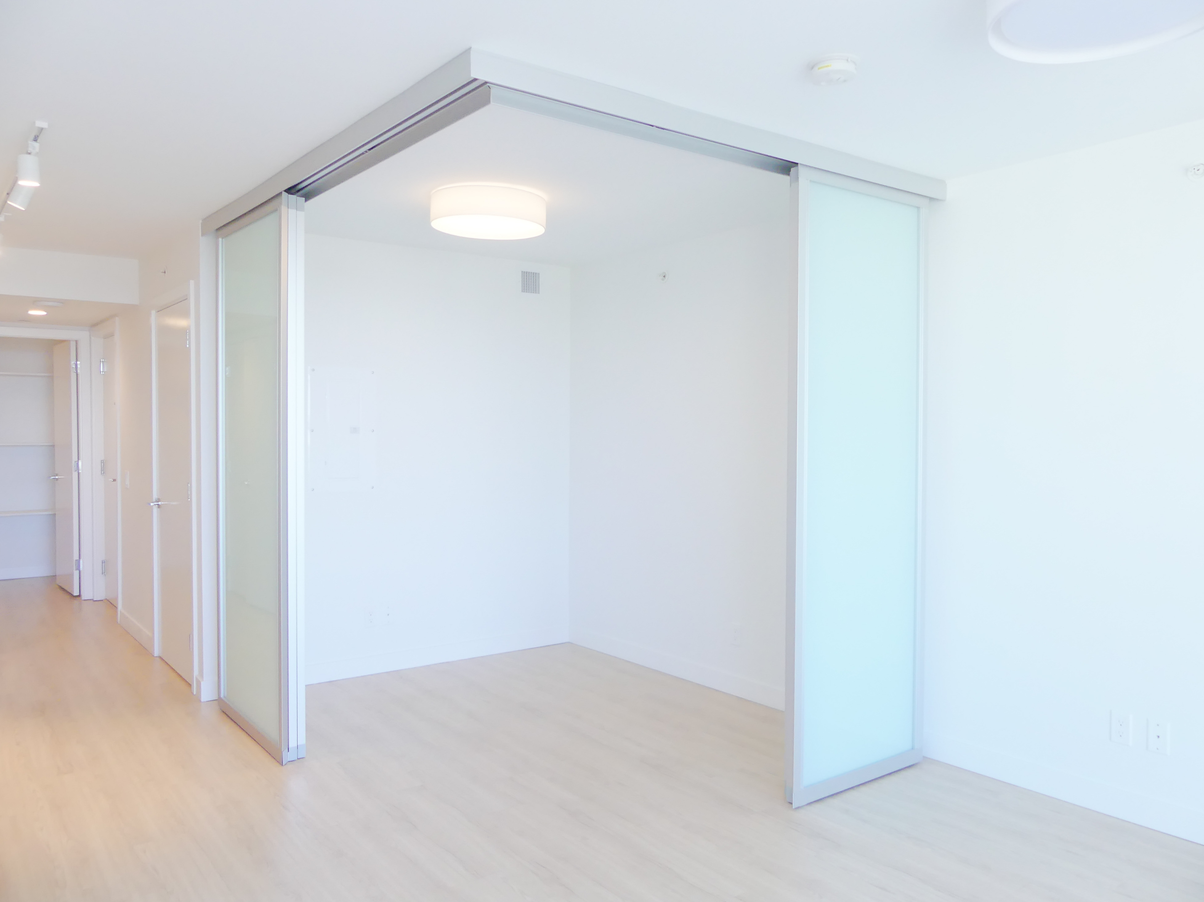 Our Jr 1-bedroom plan provides the flexibility of a studio and the privacy of a one bedroom. Sliding glass panels can shift the dynamics of the space and creates a convertible and customized home. The large flex-room is fit with a custom storage solution, giving you a walk-in closet where you’d least expect it, tucked away into 448 square feet. A natural birch palette opens up the space, while in-suite laundry and stainless-steel appliances complete this great package. A south-west balcony features views of Vancouver’s colourful Davie Village and promises beautiful natural light year-round.