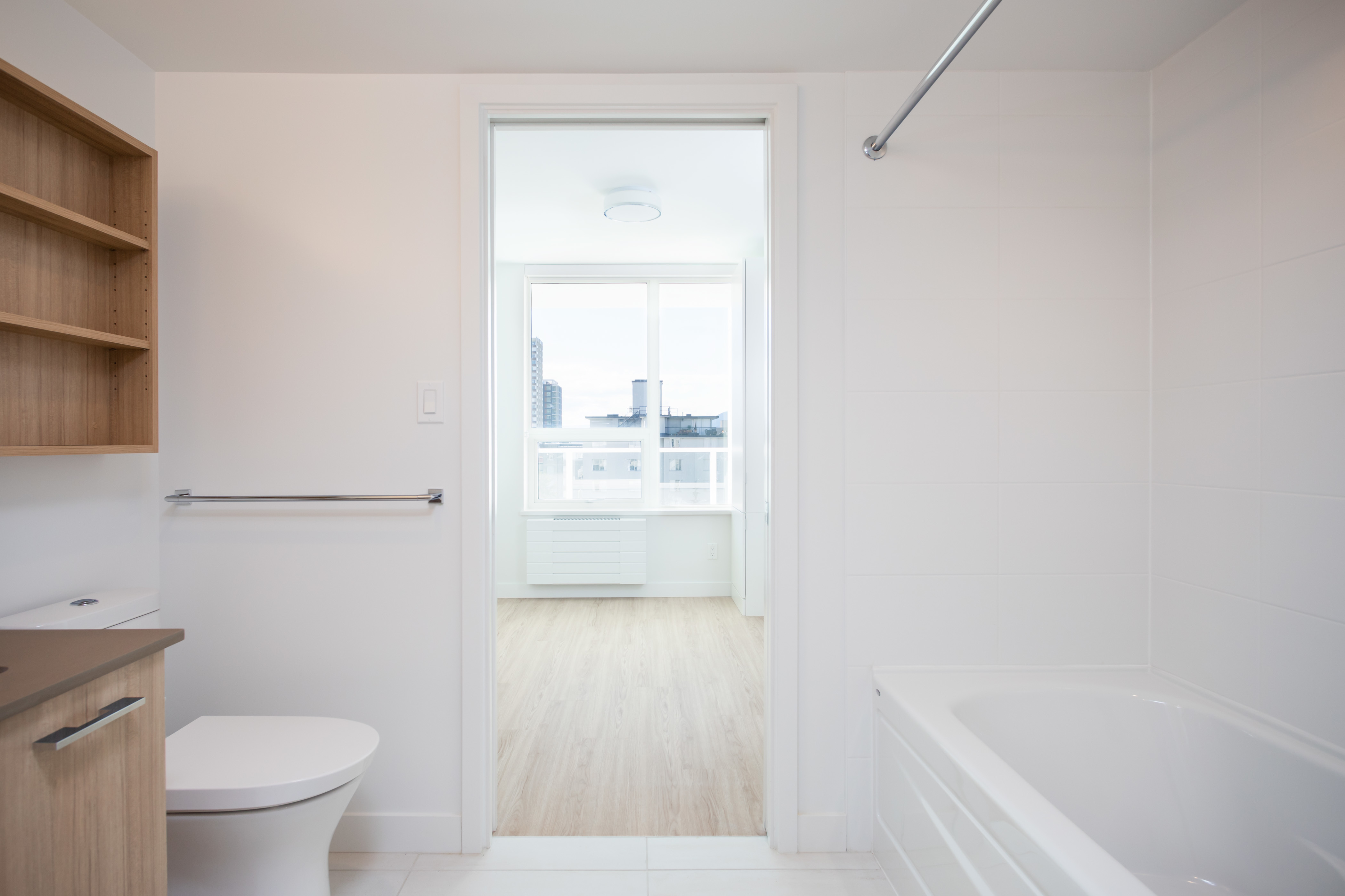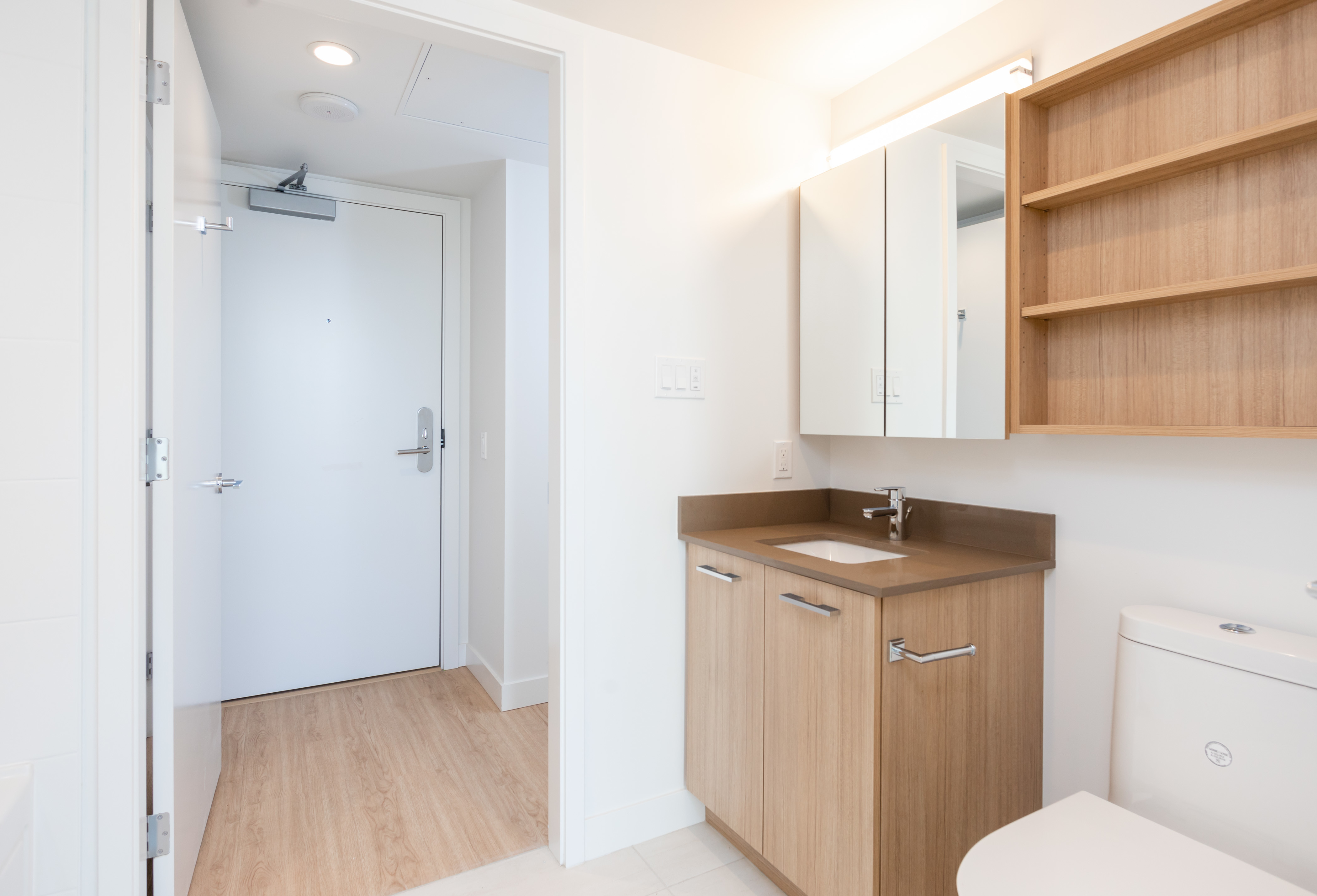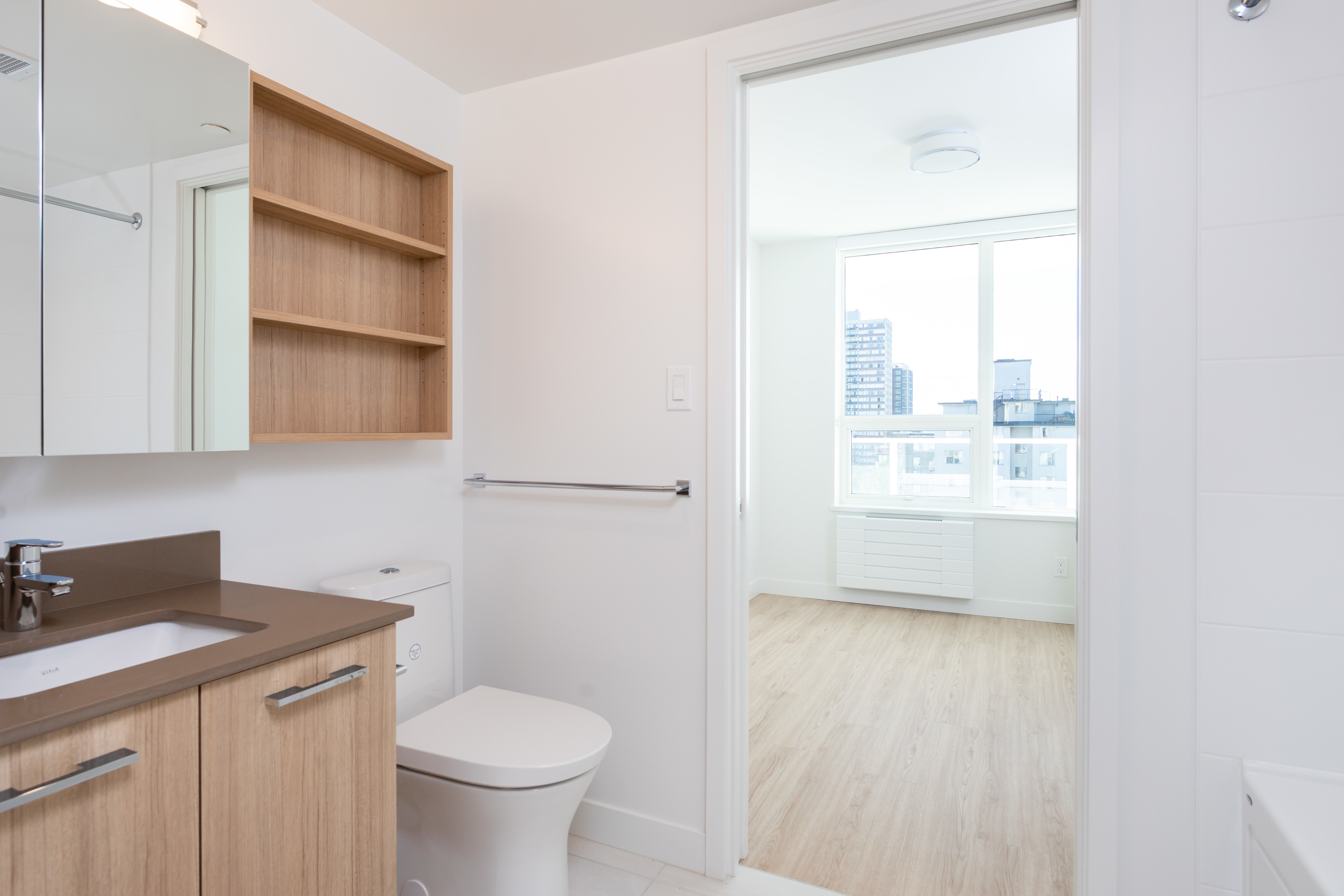 The C5 plan is one of our most favoured suites. With a glamourous western view and a large patio, this one-bedroom is a great spot to watch the sunset over English Bay. This one-bedroom home features an L-shaped kitchen to maximize every inch of this 415 square foot home; alongside this, a Jack and Jill bathroom creates great flow. Vinyl plank floors and stone counters make up some of the modern finishes in this home.
