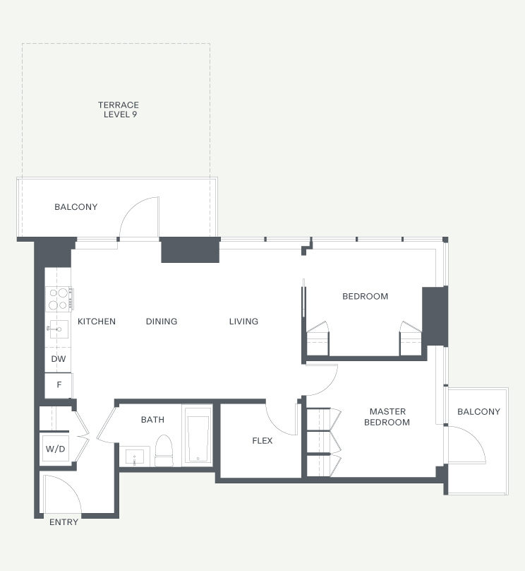 The D1 plan of 655 square feet features some amazing additions. Two balconies provide maximum views around the south west corner of the building. On one end, a quiet look at Thurlow Street, on the other a sprawling view of Davie Street, False Creek and English Bay. The galley kitchen opens up the living space, and the additional pantry extends the kitchen. A flex room can inspire you to create your own space within this thought-out design. Modern finishes tie it all together in a light and airy colour palette.
