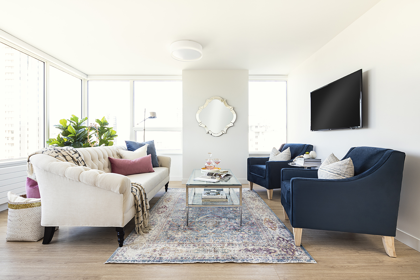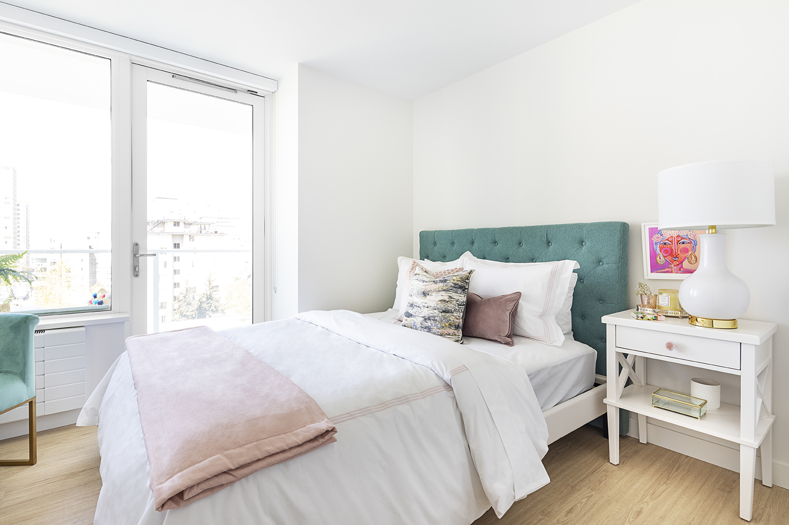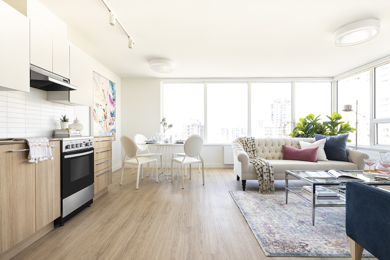 This 814sqft 2BR suite has stunning view of English bay and False Creek with a private patio in the master bedroom. This corner layout offers plenty of western light and beautiful sunsets framed by large windows. The flex room functions as an office or in-suite storage, alongside a large open concept living space.