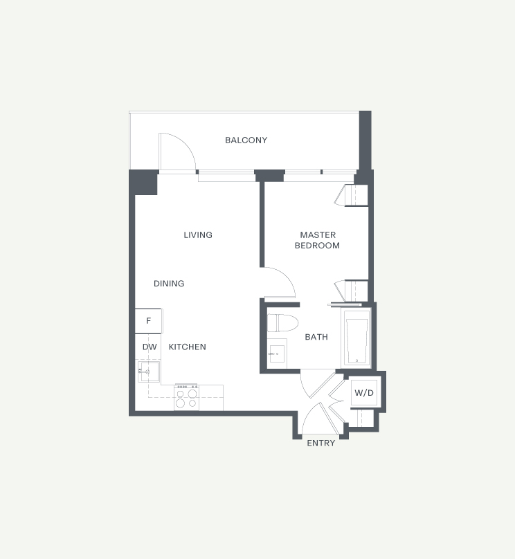The C5 plan is one of our most favoured suites. With a glamourous western view and a large patio, this one-bedroom is a great spot to watch the sunset over English Bay. This one-bedroom home features an L-shaped kitchen to maximize every inch of this 415 square foot home; alongside this, a Jack and Jill bathroom creates great flow. Vinyl plank floors and stone counters make up some of the modern finishes in this home.