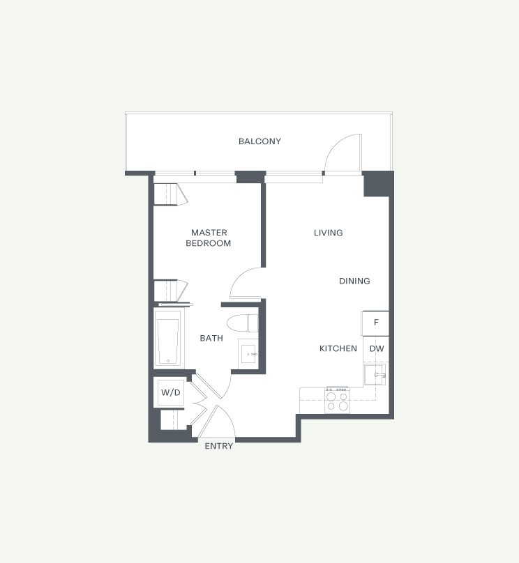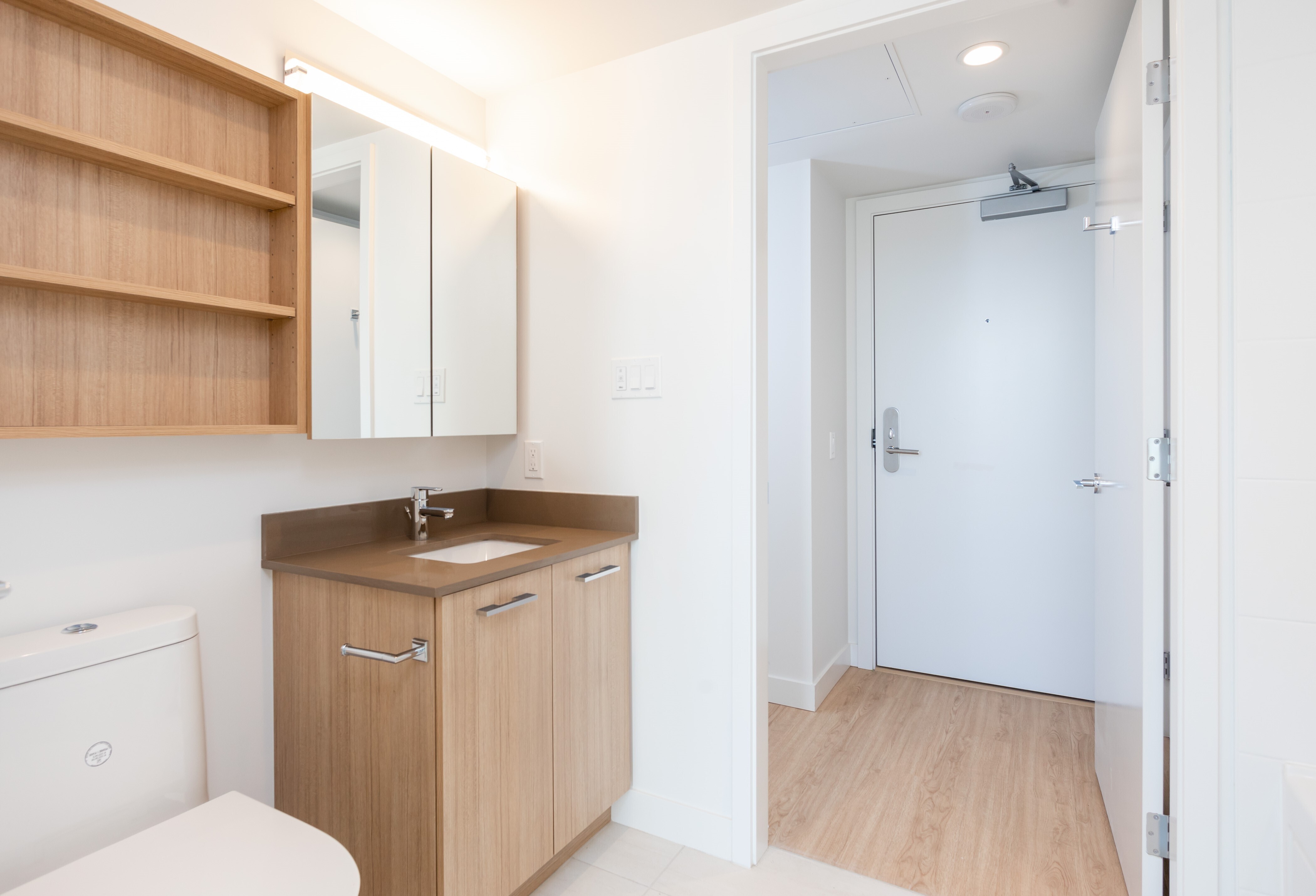 The C6 plan is one of our most favoured suites. With a glamourous western view and a large patio, this one-bedroom is a great spot to watch the sunset over English Bay. This one-bedroom home features an L-shaped kitchen to maximize every inch of this 423 square foot home; alongside this, a Jack and Jill bathroom creates great flow. Vinyl plank floors and stone counters make up some of the modern finishes in this home.