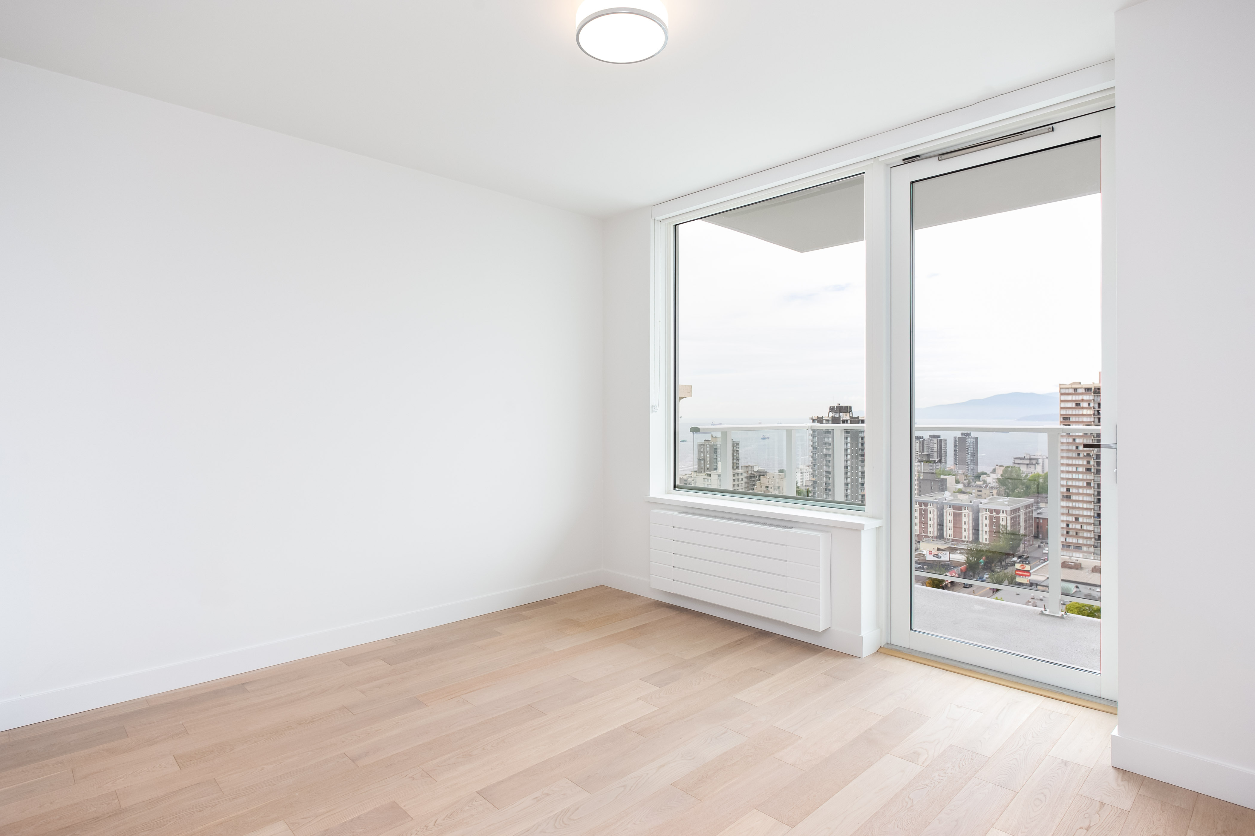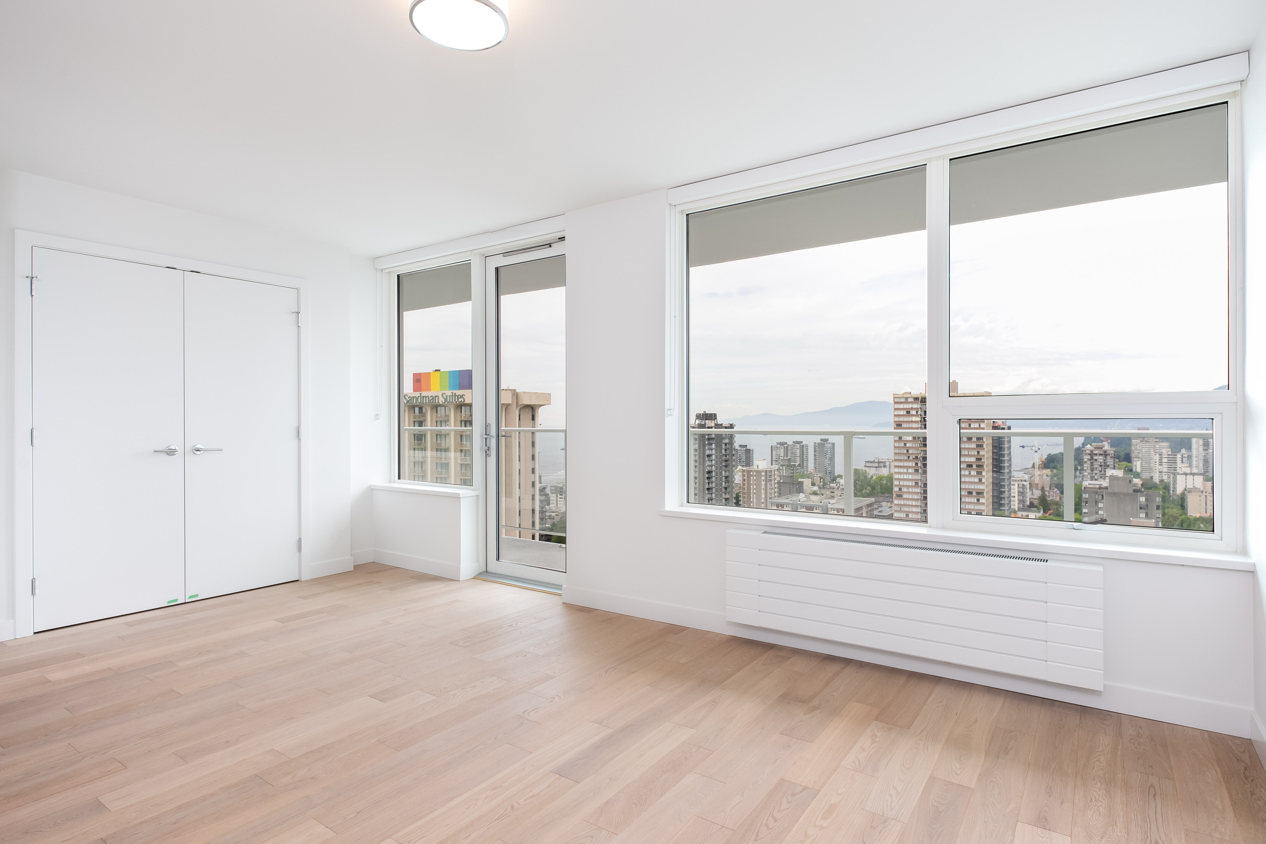 Penthouse 9 boasts 2-stories of living space and is one of two suites with a direct view of the English Bay, providing a panoramic view of the ocean, mountains and city. You can image yourself watching the fireworks from the 150sf balcony. An island in the kitchen houses a dishwasher, while the pantry has a wine cooler and topped off with a large glass-top stove. The open living space also provides a den and powder room on the main floor. The light colour palette flows throughout the space and up onto the second floor into the bedrooms which both have private washrooms. This 1228sf home invites you to experience luxurious living in one of our most exciting and centrally located neighbouroods.