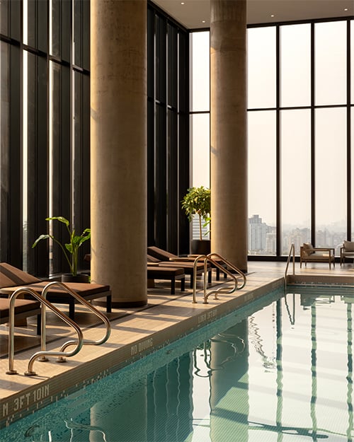 Heated lap pool and hot tub surrounded by comfortable seating nooks.